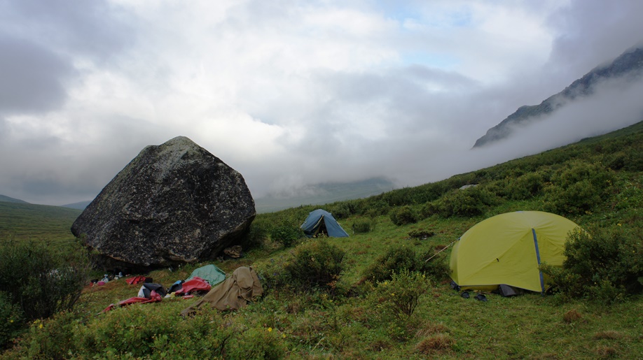 В ходе экспедиции были и неожиданные встречи с животными. Сначала отмечали следы присутствия бурых медведей в высокогорной тундре Шапшала, а затем встретили и его самого - редкого гостя этих обширных безлесных пространств. Молодое животное беззаботно приближалось к стану экспедиции, кор-мясь еще сочной зеленью альпийских лугов. Только подойдя на близкое расстоя-ние медведь заметил лагерь, здраво оценил обстановку и предпочел уйти. Судя по встреченным следам жизнедеятельности этого хищника, обнаруженным в районе исследования, он регулярно заходит со стороны Республики Тыва, где леса подступают близко по горным долинам к перевалам хребта.