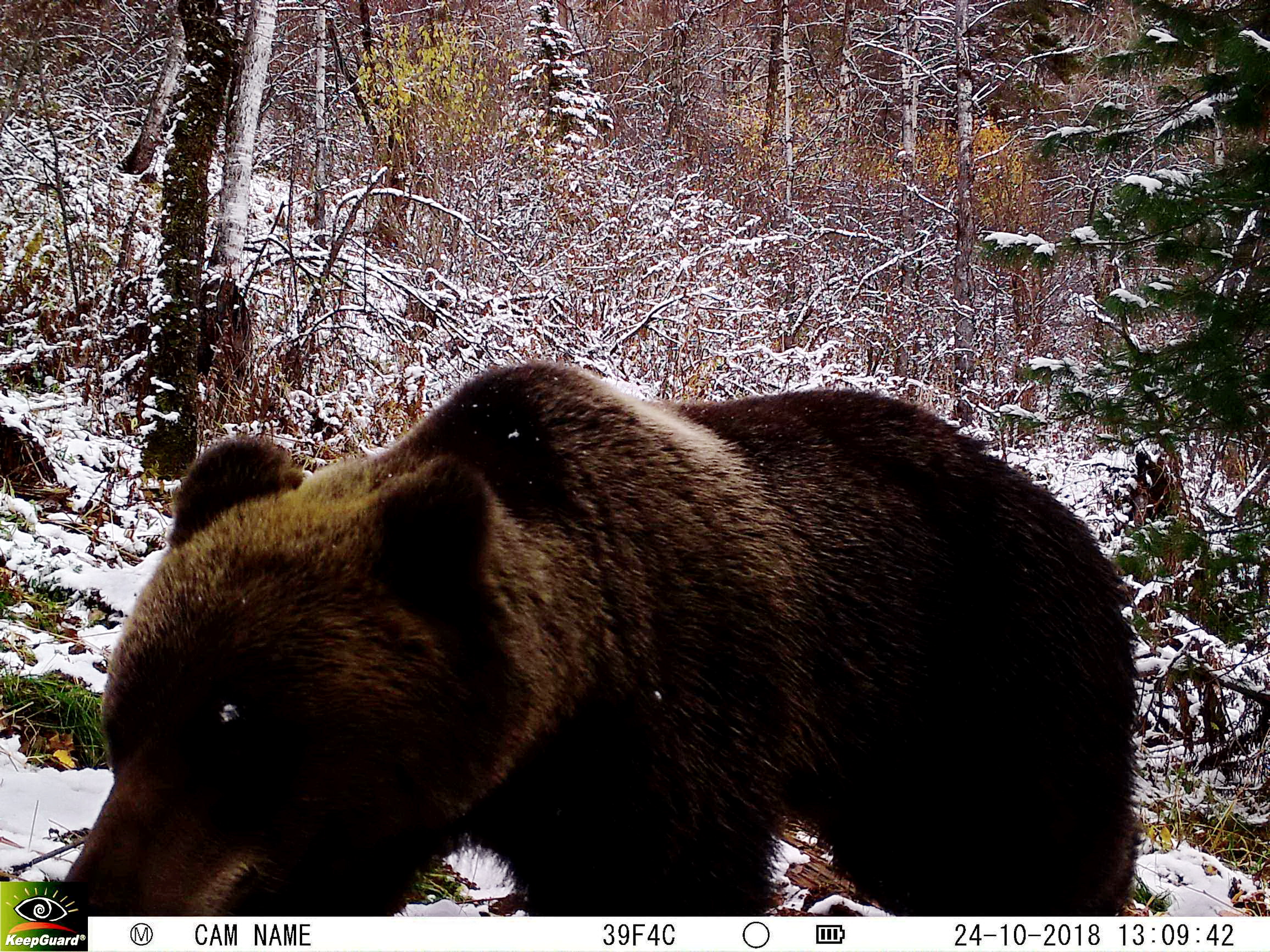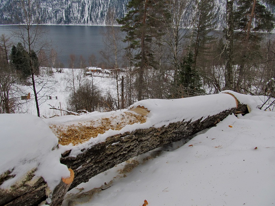 В октябре, по первому снегу, прошел мимо «нашего» бревна медведь, но не стал задерживаться возле солонца, а побрёл дальше по своим делам.