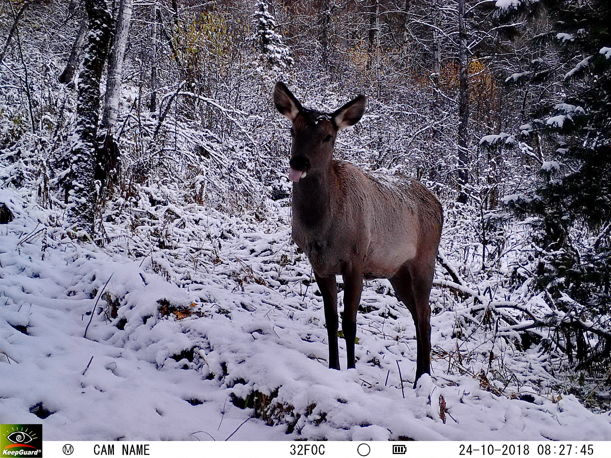 13 октября к солонцу приходила косуля, 15 октября пробежал соболь. В 20-х числах октября солонец начали активно посещать маралы: две маралухи (самки марала) и самец второгодок.