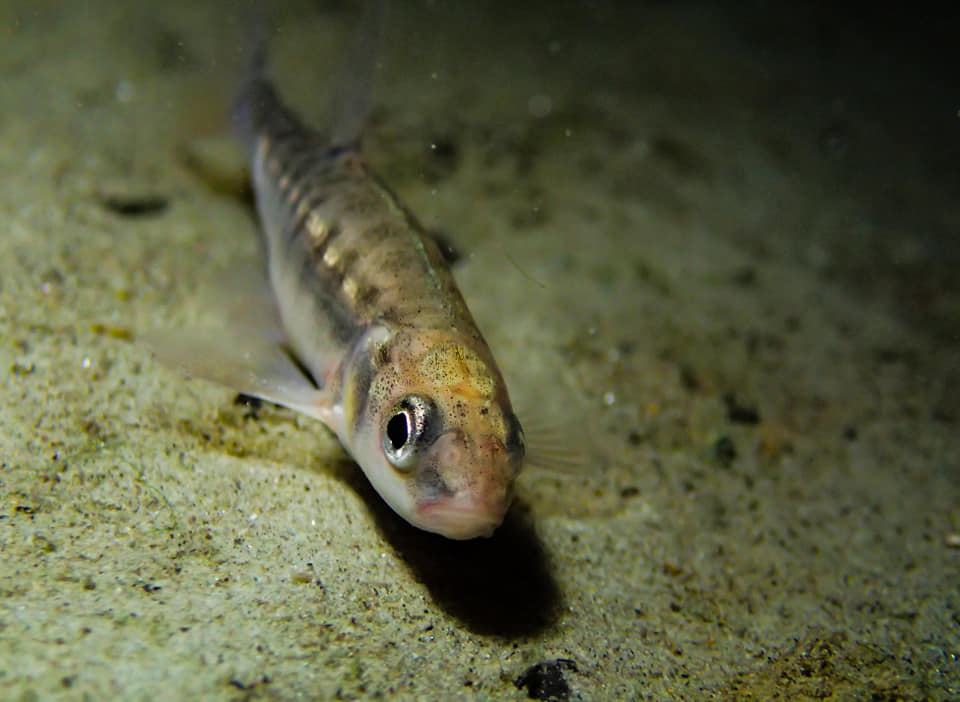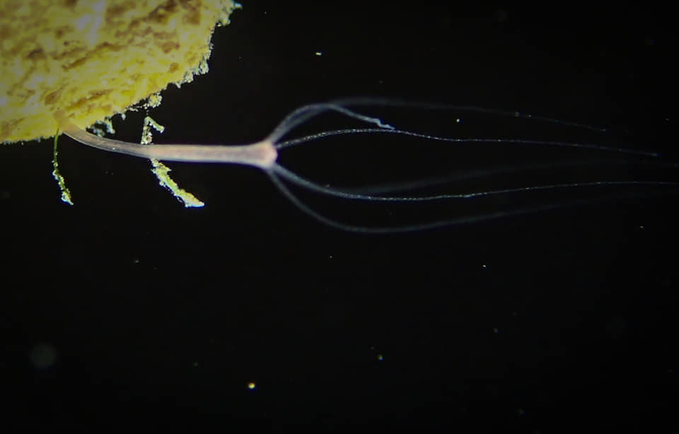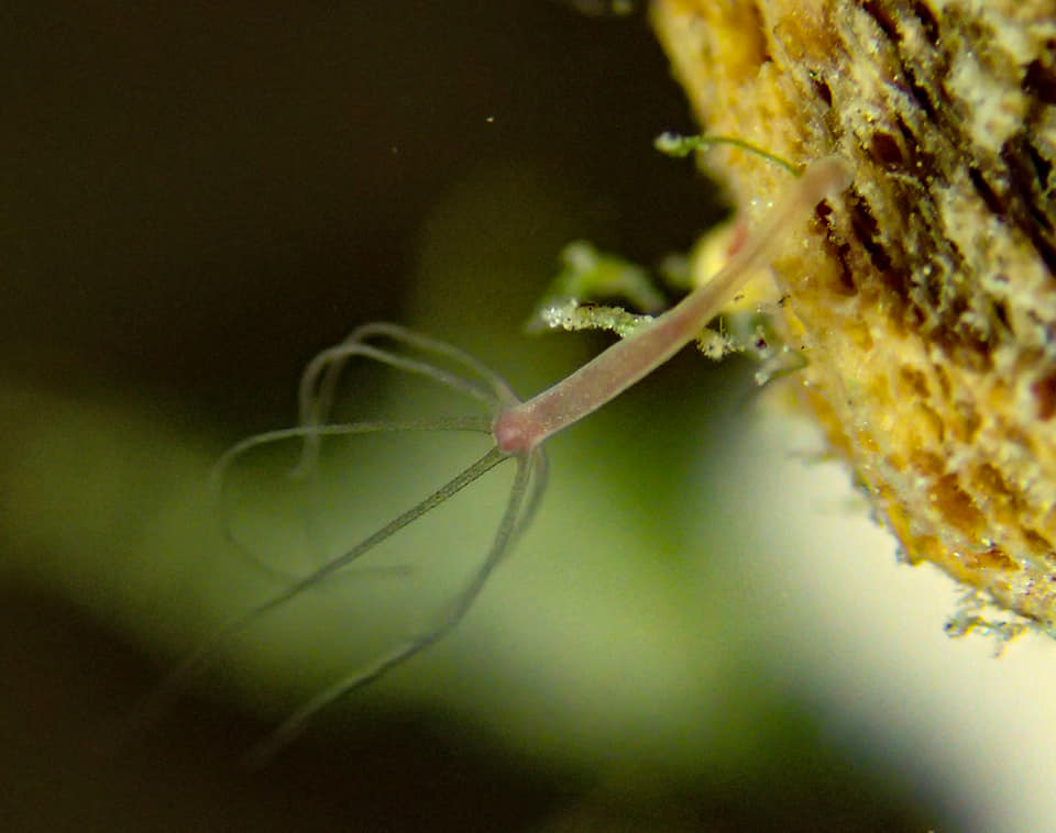 Первые три-четыре метра прибрежной полосы у поверхности представляли собой суп из гольянов, которым было вполне комфортно при отсутствии волн. Удалось отыскать и более мелких обитателей озера, гидры бледно-розового цвета, размером не больше 2 мм, хоть и очень редко, но если знать где искать, могут попасться в объектив.