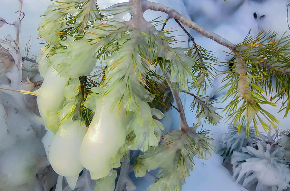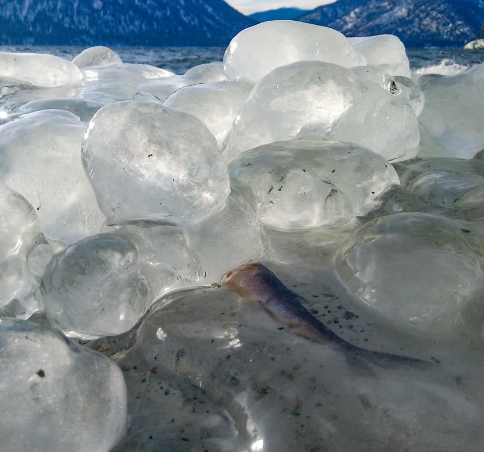 На берегу можно найтии хвою в ледяной глазури и мелких рыбок выброшенных волной и вмерзших в лёд.