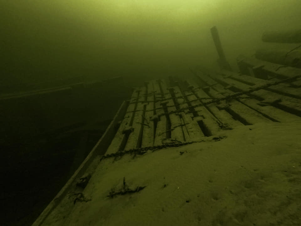 Только в вечеру стало возможным зайти в воду. Что интересно, её температура по наблюдениям сотрудников метеостанции, меняется в течение дня, утром ветер переместил с юга теплую воду, и у поверхности промерялось +1.6С, а к вечеру вода остыла до +0,7С. Взвесь поднятая волной достаточно быстро оседает, и неплохая видимость около 7 метров, несмотря на наступающие сумерки, позволила увидеть почти всю затонувшую яйлинскую дамбу с расстояния.