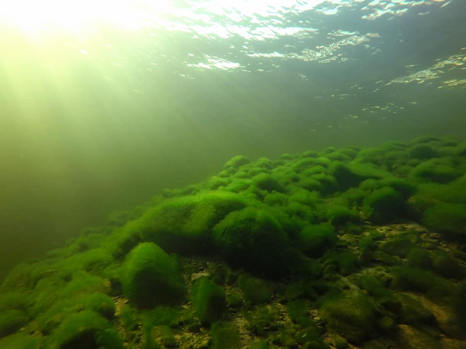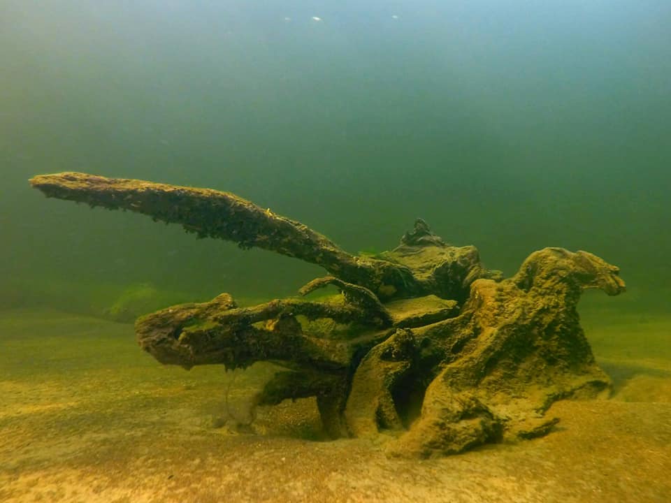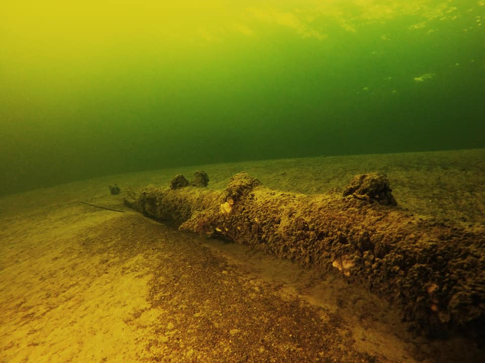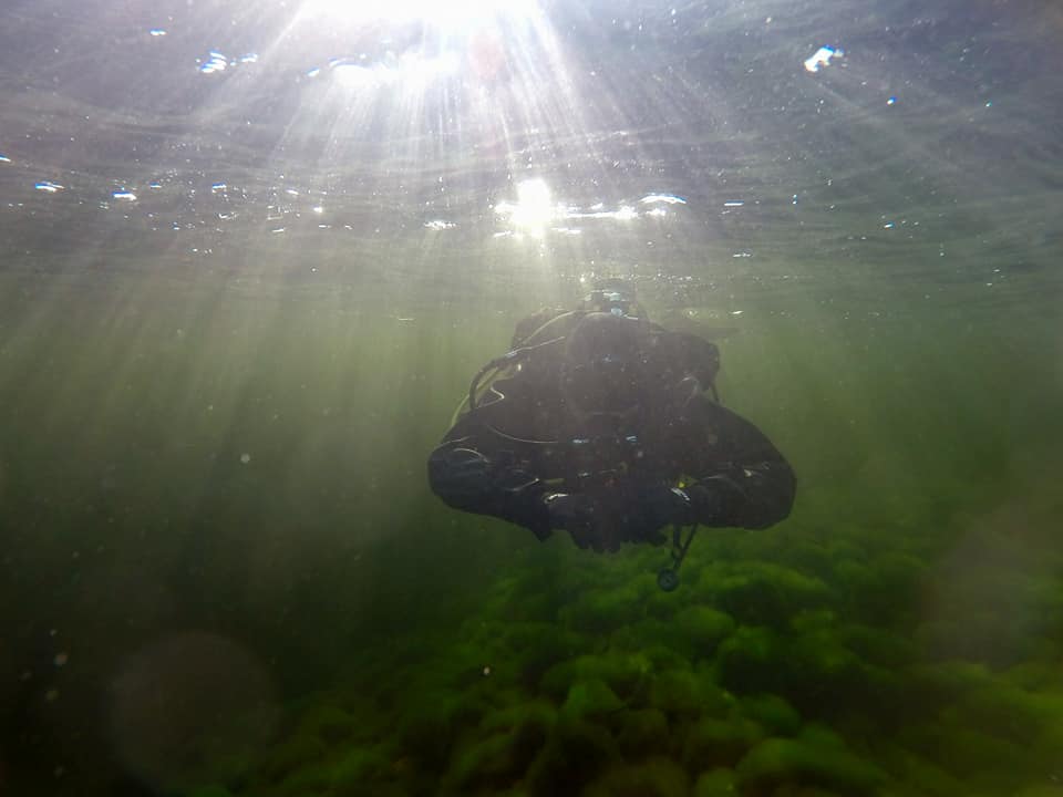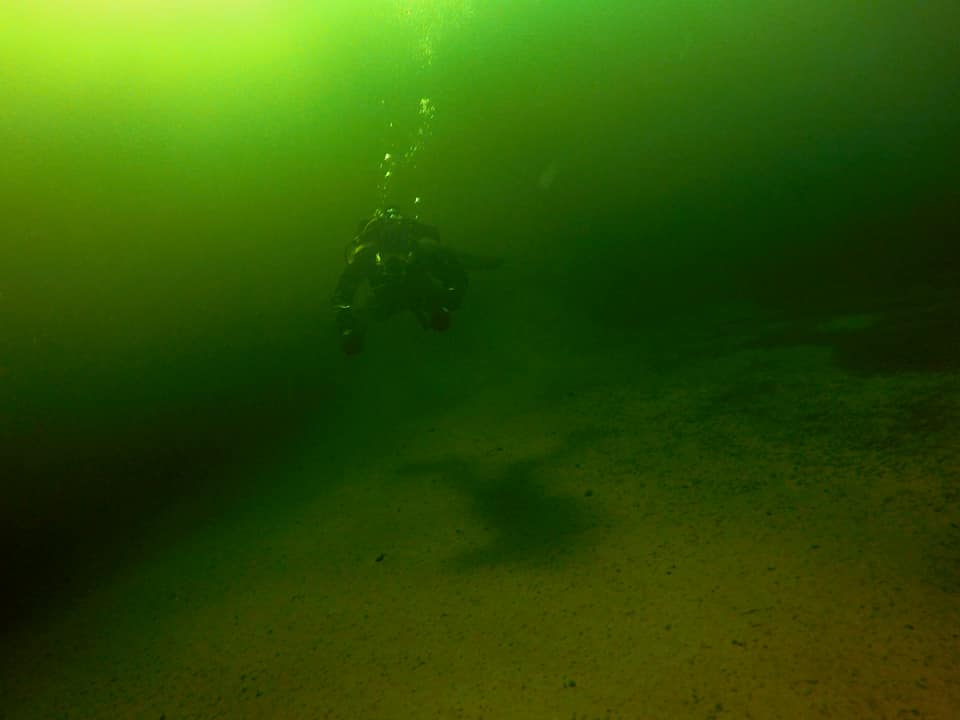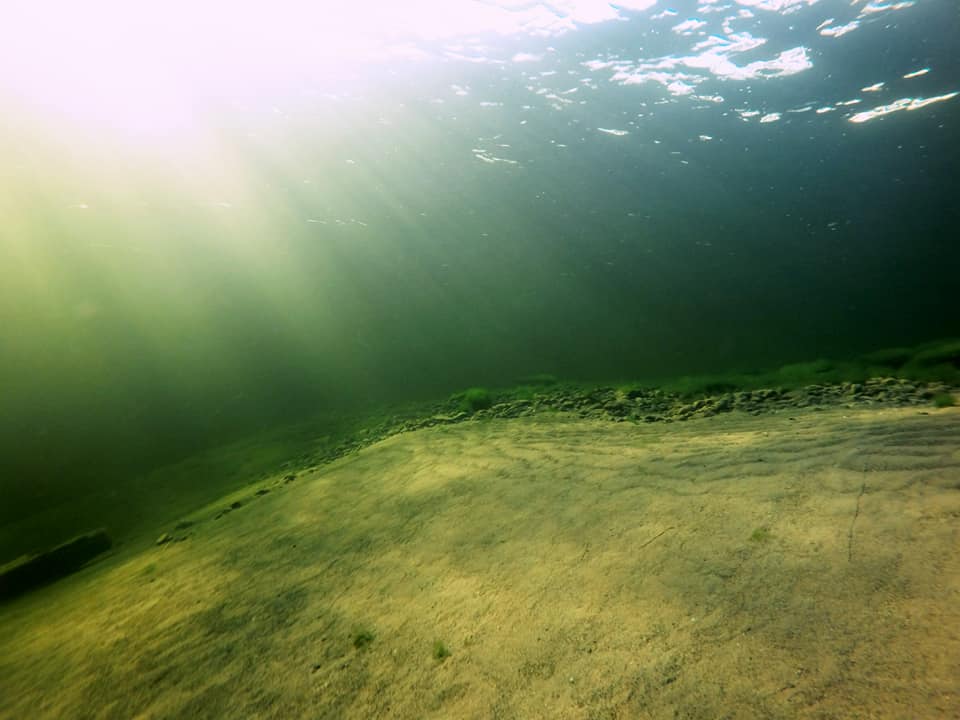 Впервые за три дня из-за плотной завесы облаков показалось солнце и голубое небо. Достаточно было половины суток чтобы непроглядная завеса взвеси после шторма улеглась и видимость под водой улучшилась с 2-3 м до минимум 15! Необычно прозрачная вода дала возможность увидеть почти всю затонувшую набержную, причудливые коряги и лунный пейзаж Золотого озера, переливающиеся лучи солнца на песке. На следующий день снова сильные волны скрыли все плотной пеленой поднятого со дна ила.