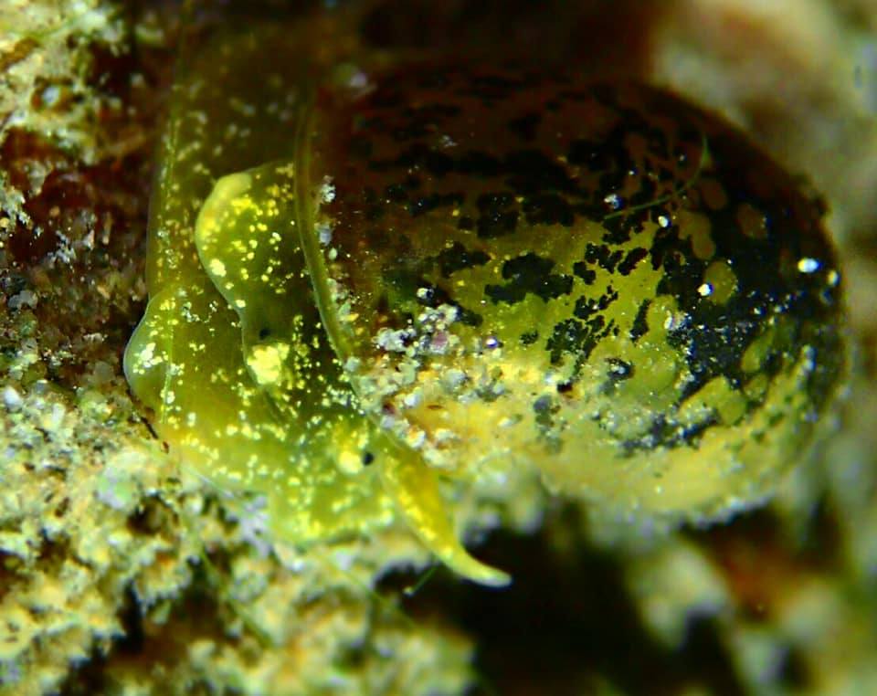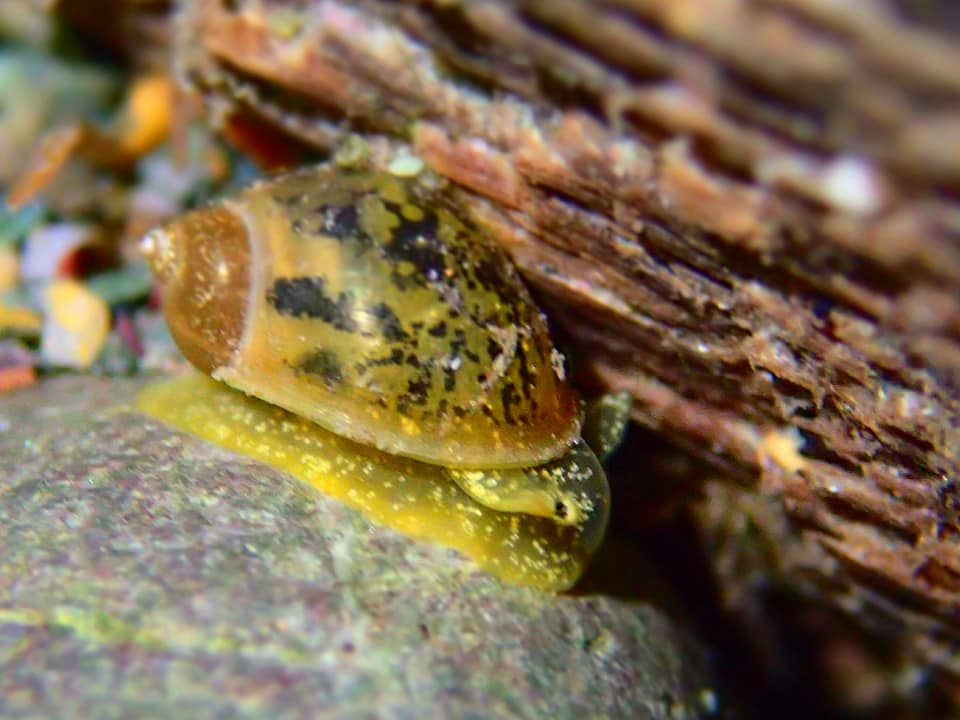 Алтайский биосферный заповедник. Микрокосмос озера Телецкое. Акватория посёлка Яйлю, глубина 6-12 м, 30 октября 2017 1:00, температура воды +6С, . Прудовик ушковатый (Limnea auriculata).