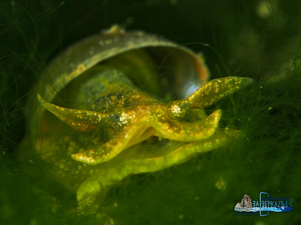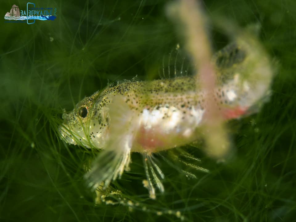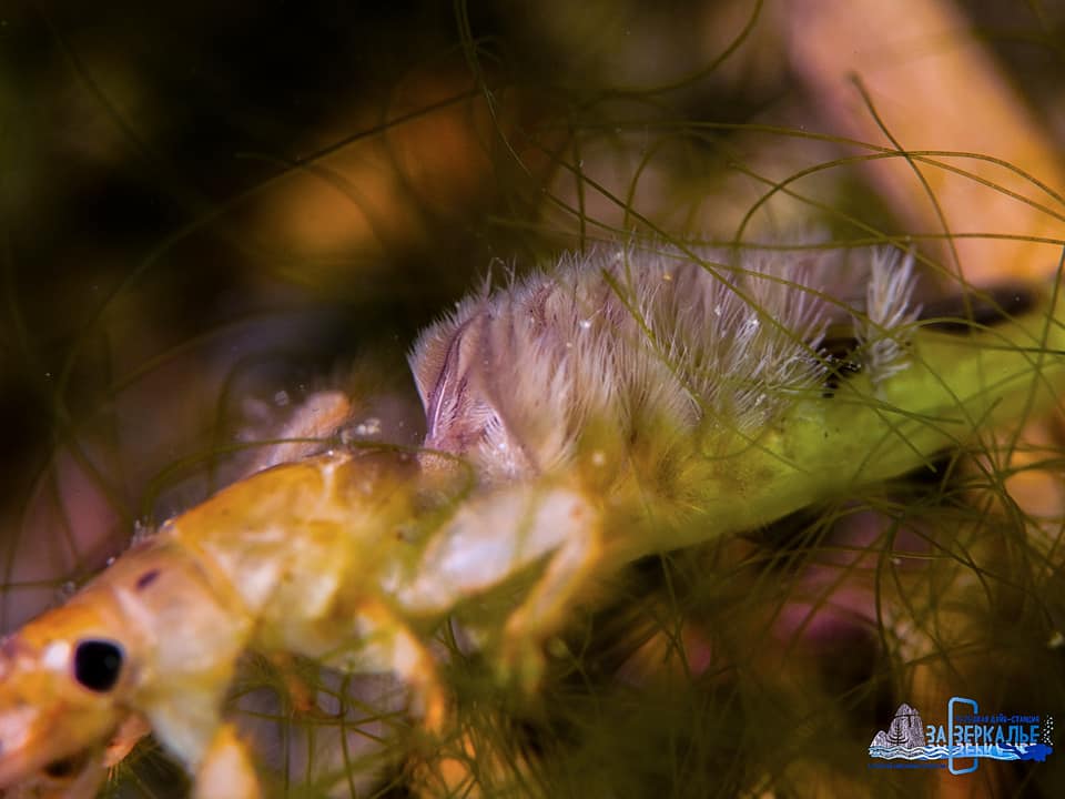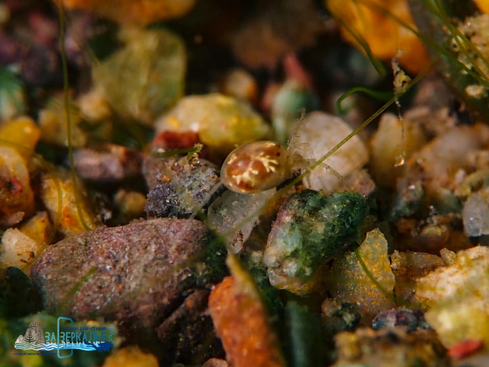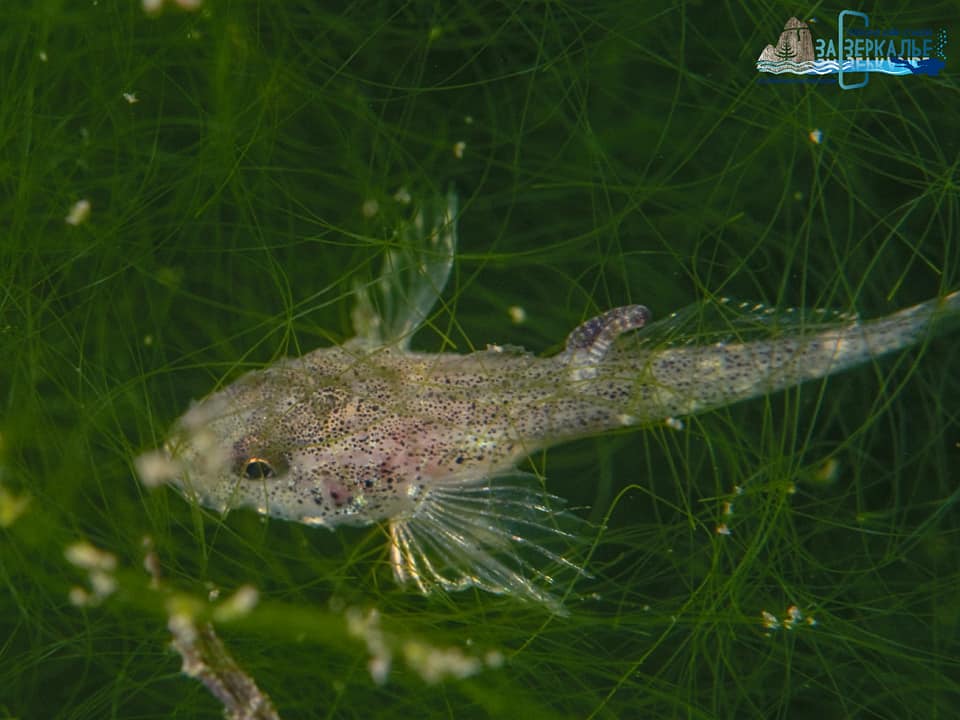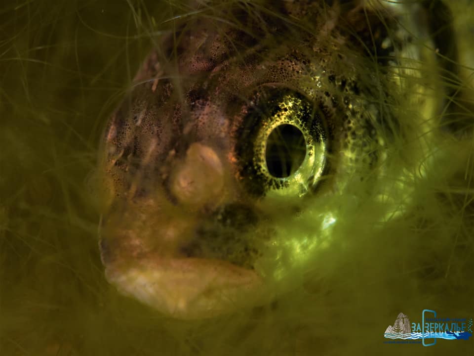На фото: спрятавшийся в обрастаниях гольян, мальки подкаменщика с присосавшейся пиявкой, ушастый прудовик, водяной клещь и пресноводная губка бадяга.