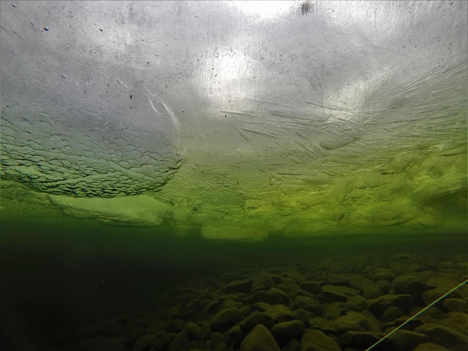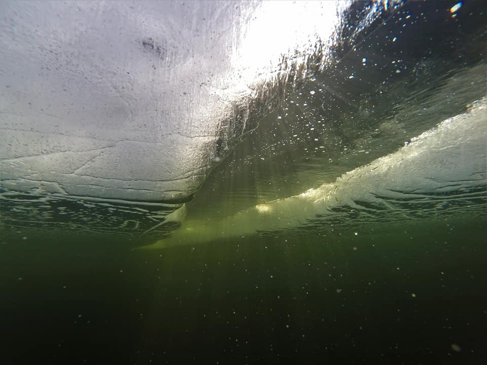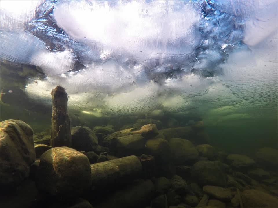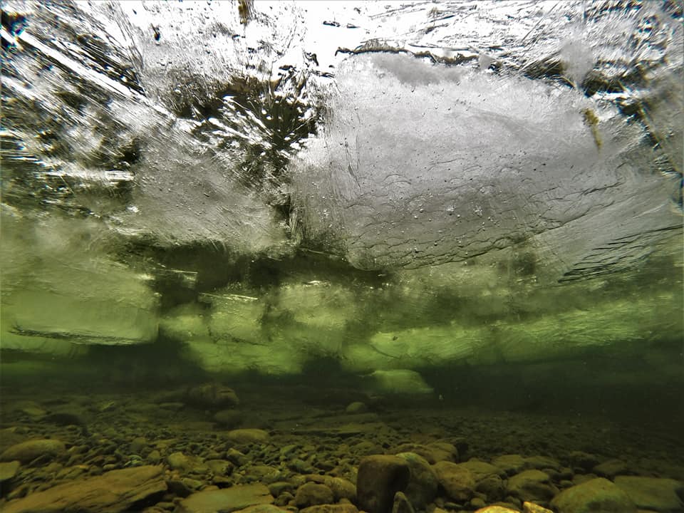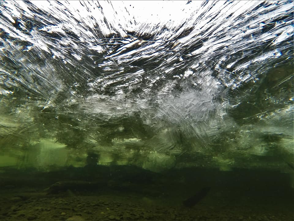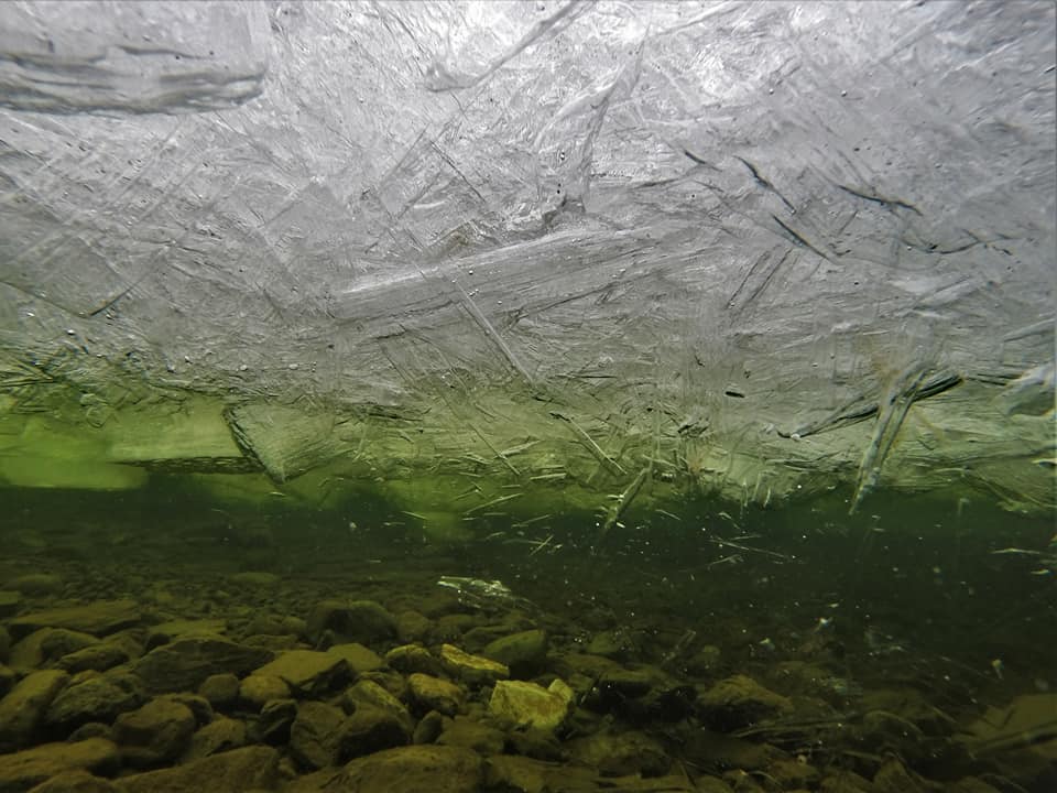 Из под воды можно наблюдать потрясающую игру света в хрустальных иглах на которые распадается ледяной панцирь.