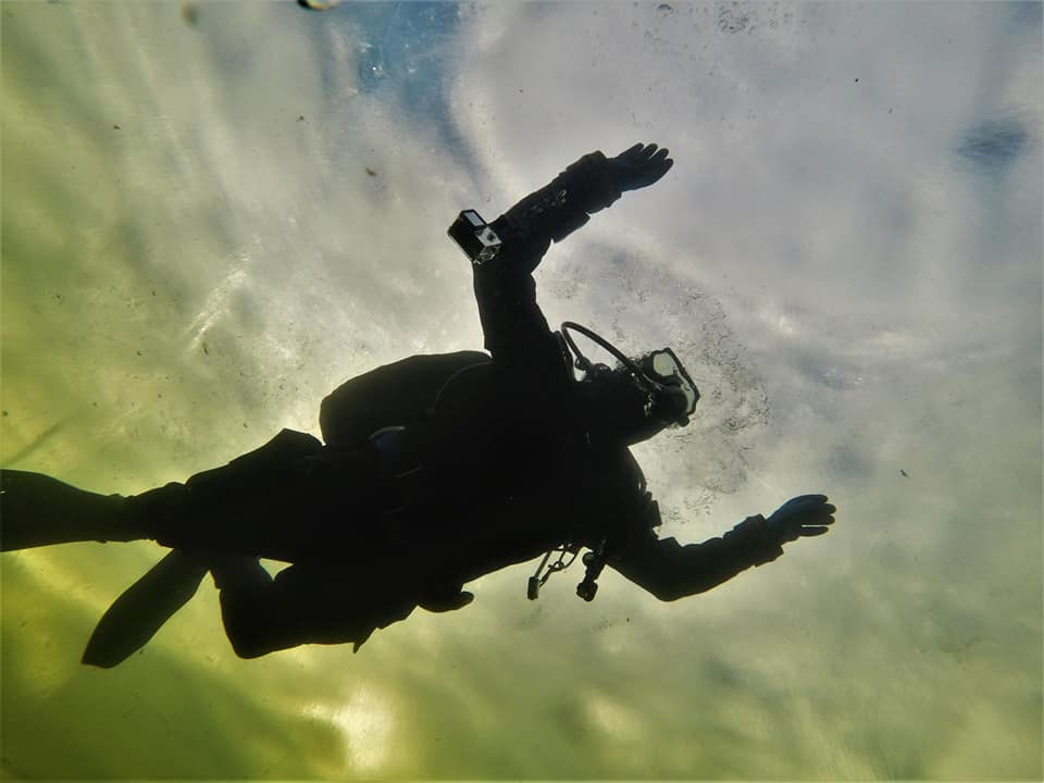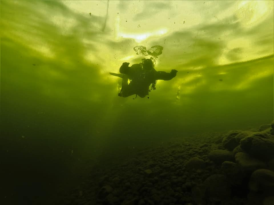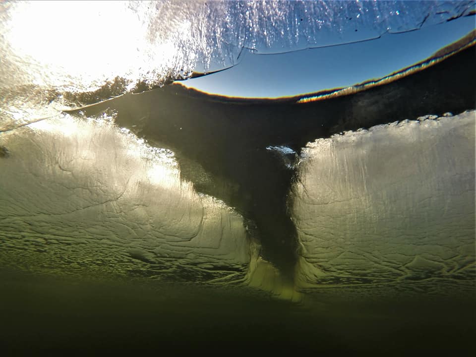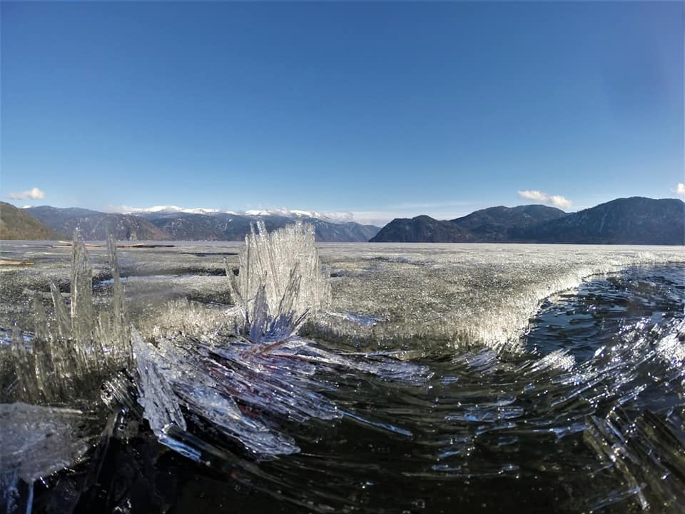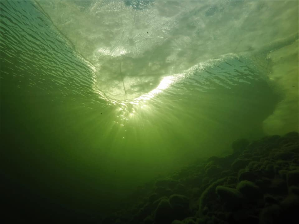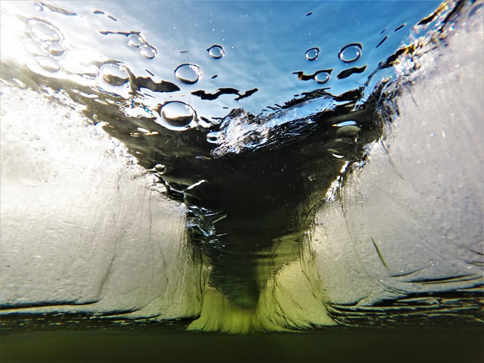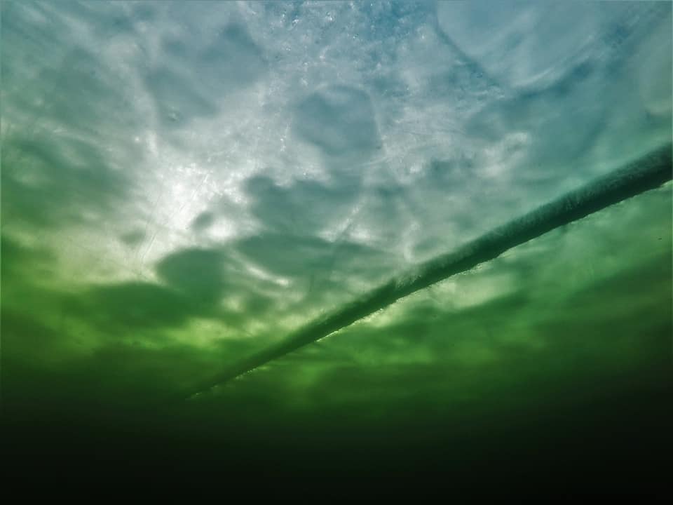Из под воды можно наблюдать потрясающую игру света в хрустальных иглах на которые распадается ледяной панцирь.