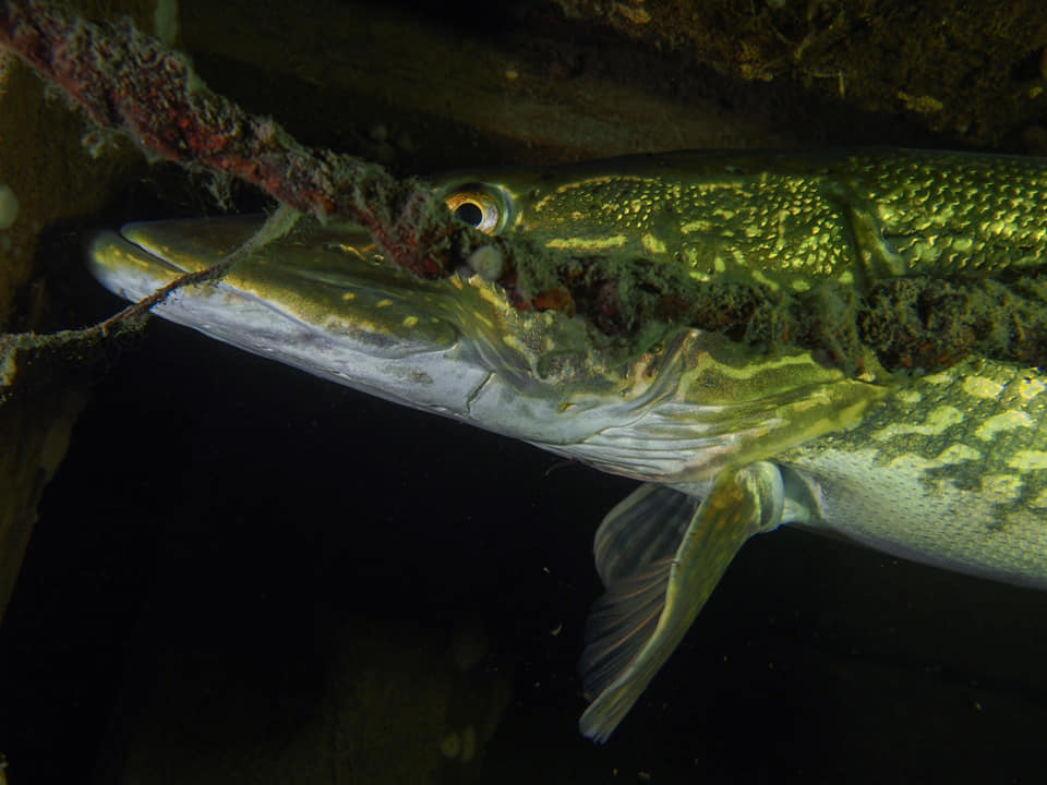 В декабре 2017 года в акватории поселка Яйлю, у затонувшей дамбы, мы впервые увидели эту красавицу. Крупная, около 1 метра, хищница никуда не уплывала, не боялась, а наоборот проявила неподдельный интерес к дайверам, сделав несколько заходов на нас, чтобы рассмотреть, кто же вторгся на её территорию и ушла когда ей надоело наше излишнее внимание и свет фонарей. Очень хотелось верить, что такая общительная и красивая рыбина просто уплыла в другое место (хотя щуки и считаются условно оседлыми) и не попала в брошенные сети (а такое мы, к сожалению, видели не раз), её не выловили рыбаки и не съел кто-то покрупнее.
