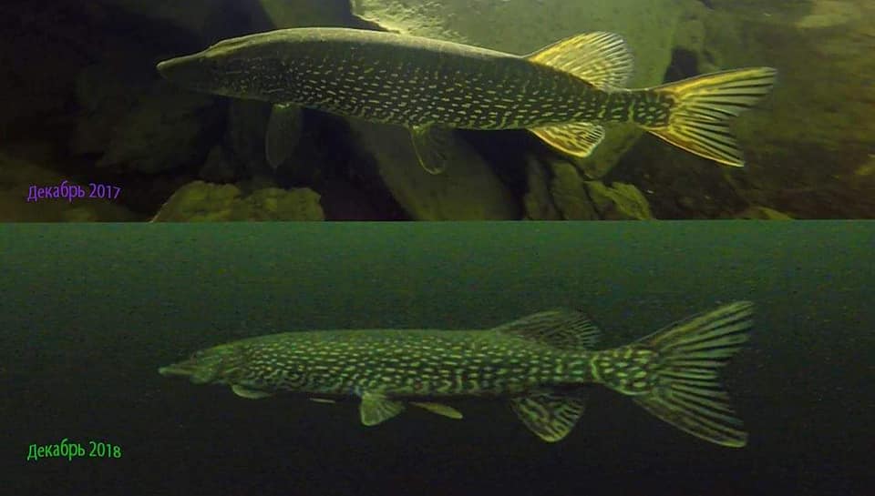 И вот в начале декабря уже 2018 года, неожиданно обнаружили отдыхающего на бревнах крупного "крокодила". Эта щука была заметно больше прошлогодней, но сделав скриншоты с видео в 2017 и 2018 годах и сравнив расположение и форму пятен не повери своим глазам, рыбина та же!