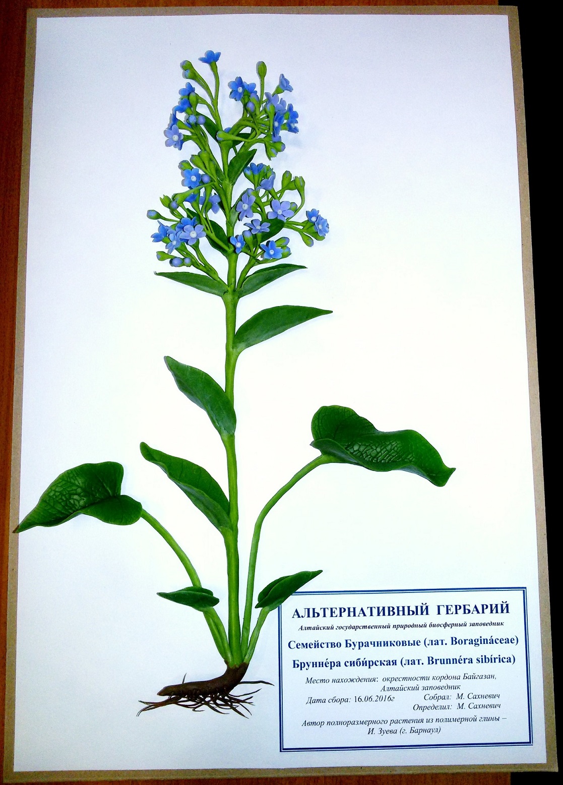 «Альтернативный гербарий». Идея его заключается в том, с помощью технологий керамической флористики создается полноразмерная копия растений. С помощью такого гербария посетители визит-центров смогут увидеть виды растений, произрастающие на территории Алтайского заповедника. В качестве «первой ласточки» было выбрано растение с названием бруннера сибирская.