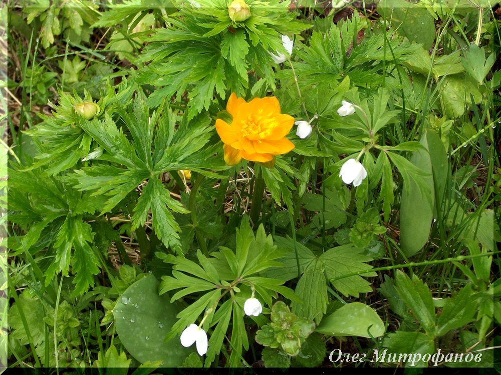 Ветреница голубая (белая форма) и Купальница азиатская.