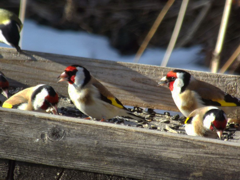 а кормушку захватили черноголовые щеглы (Carduelis carduelis).