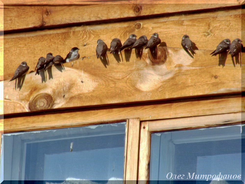 В поселке* неожиданно задержалась стая береговых ласточек; птицы грелись даже на оконных наличниках.