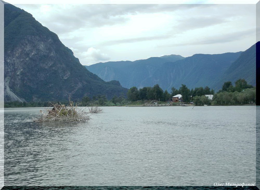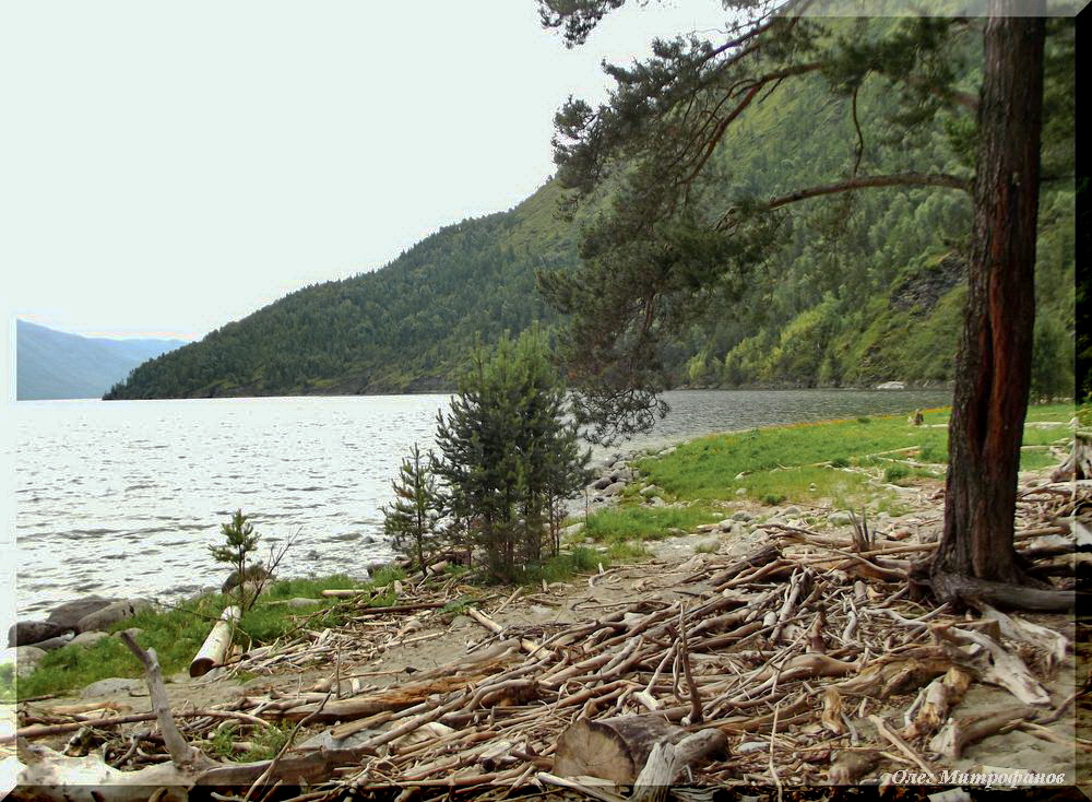 Вид Телецкого озера у мыса Чоодор. Виден перепад уровня воды в озере.