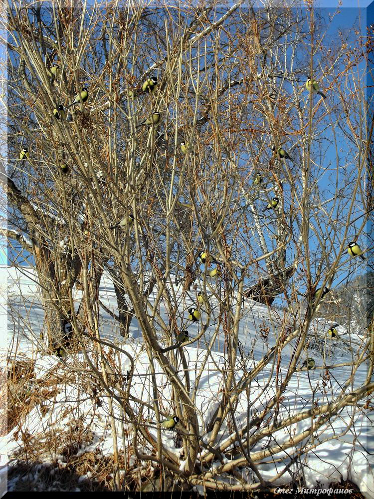 Теперь о птичьем населении - оно осталось на прежнем уровне, как в январе, лишь чуточку уменьшилось количество особей зимующих видов. Например, количество свиристелей Bombycilla garullus сократилось (птицы переместились в равнинный Алтай).
