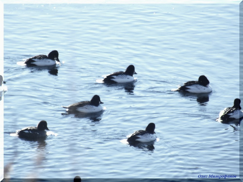 Гоголи Bucephala clangula кормятся в прибрежной зоне на краю шуги.