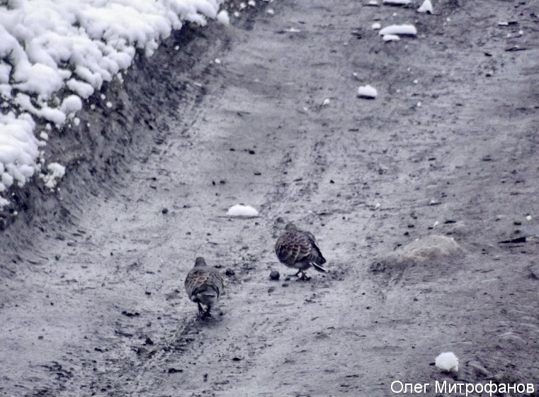 Пара большиъ горлиц вынуждена кормиться на поселковой дороге.