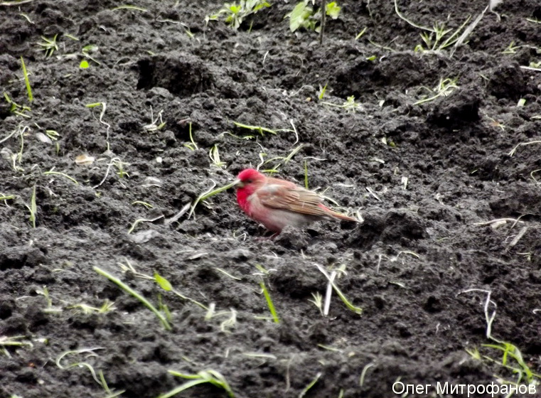 Самец обыкновенной чечевицы кормится на вспаханной земле.