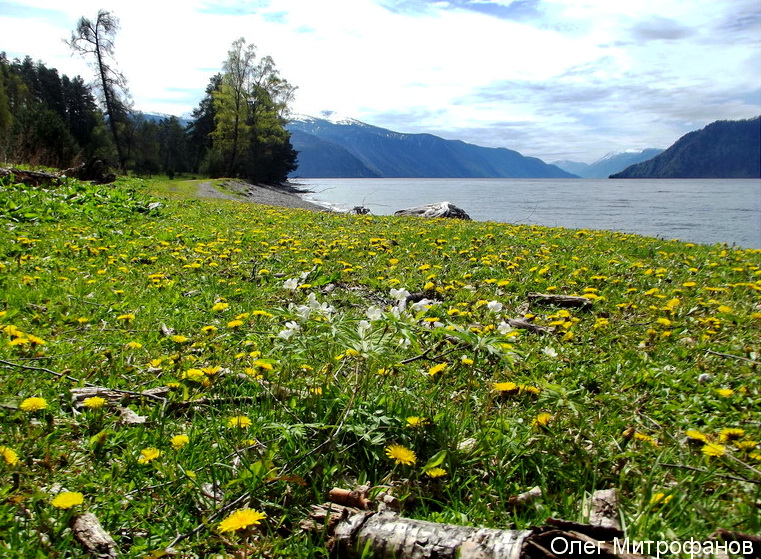 Массовое цветение одуванчиков на берегу Телецкого озера.