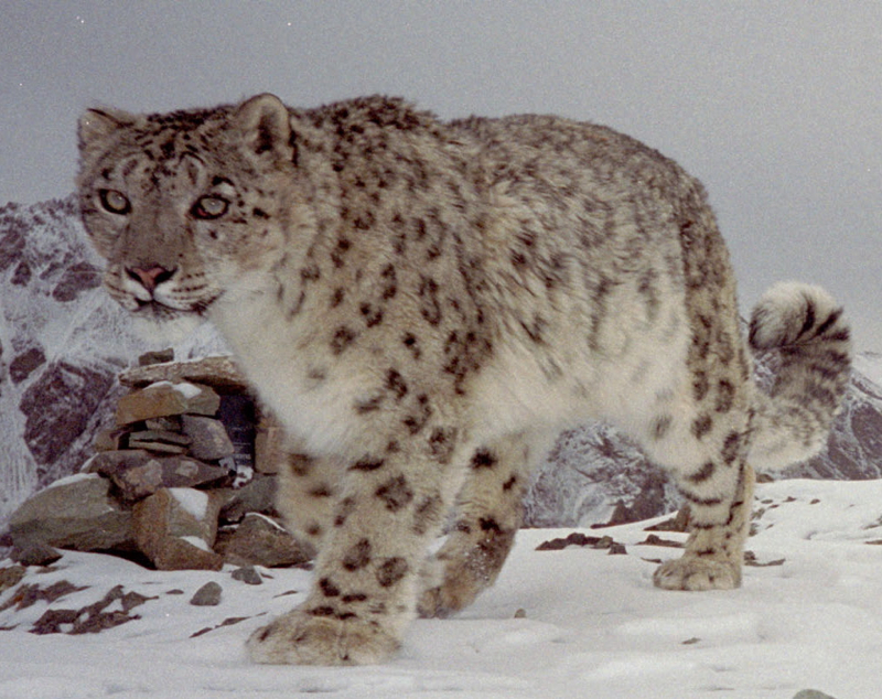 Snow leopard on the prowl. Photo by Snow Leopard ConservancyLike many other mountain peoples, the Altaian people have an ancient tradition: in order for a boy to become a man he must meet and conquer the Snow Leopard. However, this encounter should not end in the flow of blood and killing of a snow leopard. The youth remembering that “the best battle is a battle which never occurs,” should force the Big Wild Cat to give way. But as often happens due to human greed, a person cannot hold back and may try to kill a snow leopard for its very beautiful and thus very valuable coat. Because it is nearly impossible to come upon a snow leopard in these mountains among the rocky cliffs and steep chasms, evil and greedy people set snares and traps for the animal.