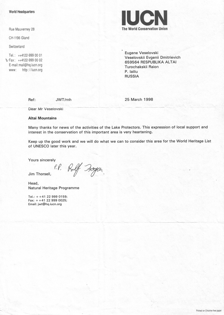 После долгих обсуждений приходит идея написать письмо-обращение в международную организацию ЮНЕСКО, занимающуюся вопросами сохранения природы, чтобы Телецкое озеро включили в Список всемирного природного наследия человечества и тогда оно получит высший природоохранный статус….