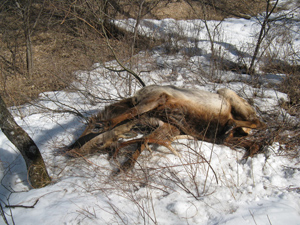 «Пока я фотографировал, мой спутник распутал этот узел рогов и копыт при помощи палки. Маралу было около 4-х лет, рога его сильно пострадали в период боев с соперниками во время гона – левый рог почти полностью обломан, остался только первый надглазничный отросток. Получив свободу от самого себя, бык перелег на живот, не торопясь встал, «пощелкал, поскрипел» зубами, запугивая нас или так выразив свои эмоции, и пошел рысью в гору. Не распутай мы его, марал, конечно же, погиб бы - для жвачных долгое нахождение в таком положении губительно. Трагично бы закончился для него этот трюк и при преследовании волками. Видимо «талантливый марал», убегая по густо заросшей акацией тропке, наклонился под ствол старой черемухи и просто заступил передней ногой за рог, чему способствовали и очень не сбалансированные рога (из-за слома), повалив и зафиксировав незадачливое животное. По приходу в поселок нам не сразу поверили, как-никак 1 апреля было на дворе, но показанные фотографии убедили и развеселили собеседников. И у диких животных бывают казусы».