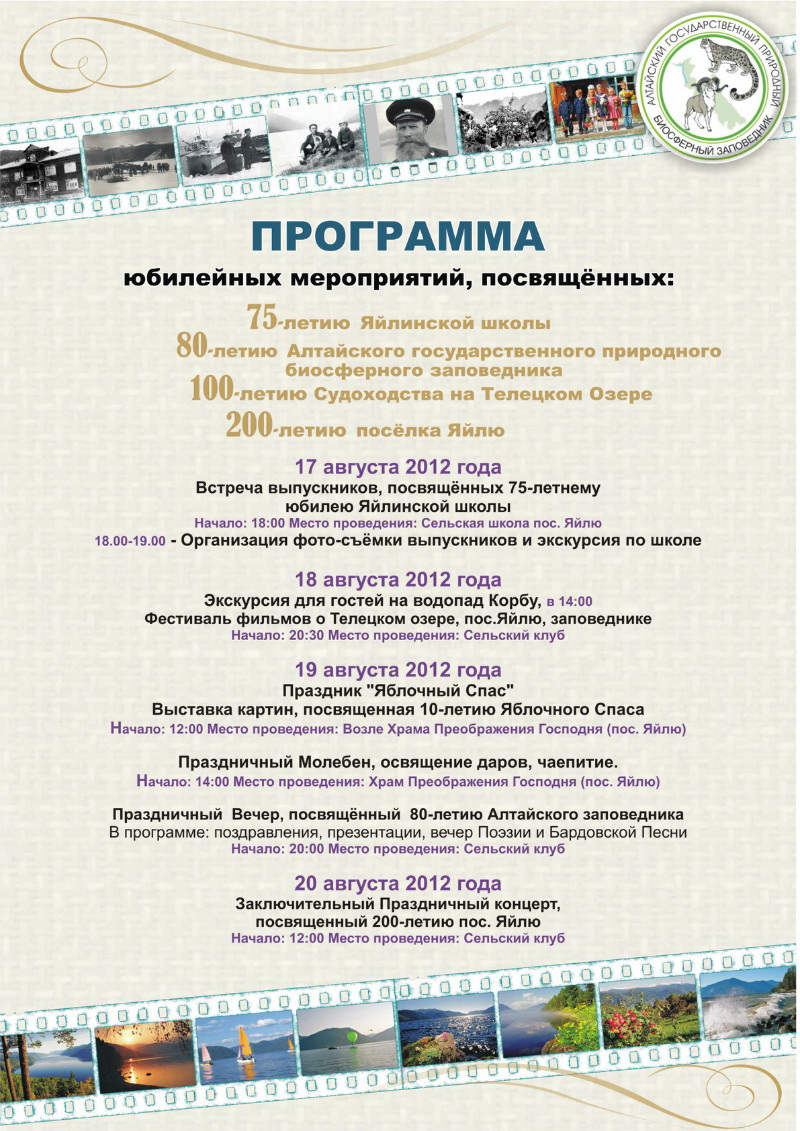 С 17-го по 20-е августа 2012 года в центральной усадьбе Алтайского заповедника пройдёт юбилейные мероприятия, посвящённые сразу нескольким значимым событиям: 75-летию Яйлинской школы, 80-летию Алтайского государственного природного биосферного заповедника, 100-летию пароходства на Телецком озере, 200-летию пос. Яйлю.