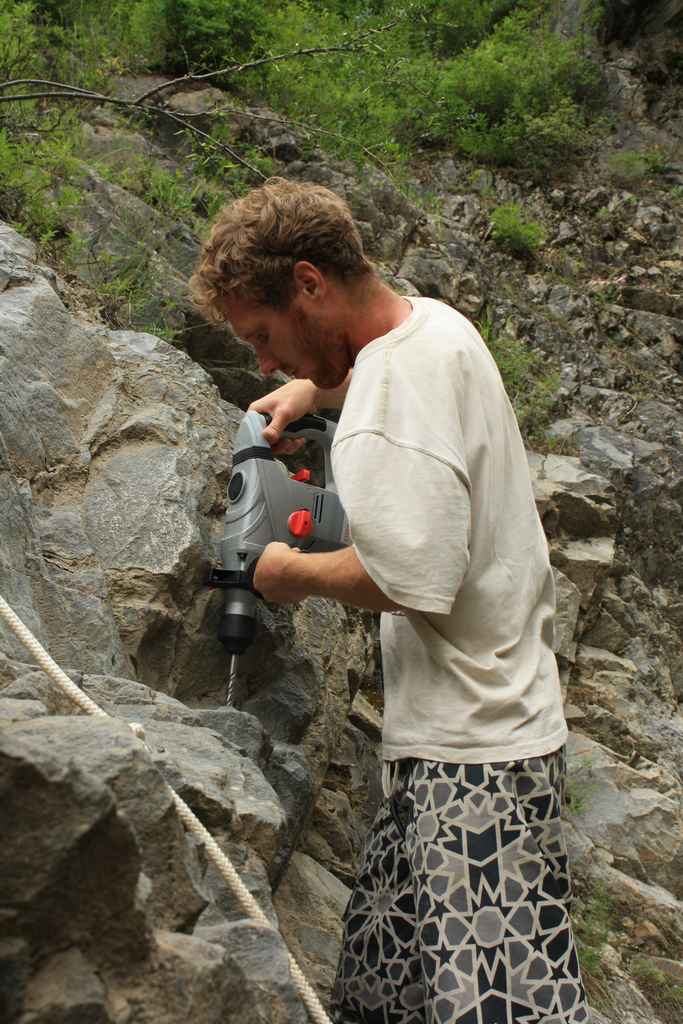 была произведена экспертная оценка сложных участков пути к водопаду и намечены планы по их обустройству. В период с 2 по 6 июля текущего года, был оборудован наиболее труднопроходимый участок – скальный прижим на середине тропы к водопаду. Ранее здесь навешивалась обычная страховочная веревка, но ее явно было недостаточно для людей неподготовленных к подобным маршрутам. Было принято решение оборудовать участок металлическими скобами и системой крепежей. Такая система в общемировой практике альпинизма называется виа феррата*.
