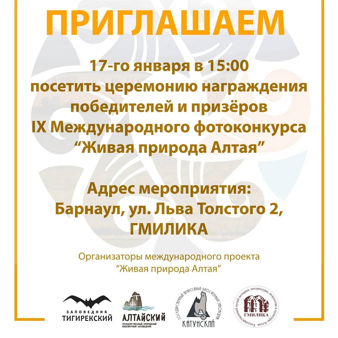 17 января в 15:00 в Государственном музее истории литературы, искусства и культуры Алтая (по адресу: Барнаул, ул. Льва Толстого 2) на церемонии торжественного закрытия фотовыставки «Живая природа Алтая-2019» будут названы лучшие работы и победители IX Международного фотоконкурса “Живая природа Алтая”.