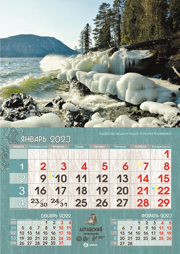 Издан новый календарь на 2023 год с фотографиями пейзажей Алтайского заповедника. Авторами фото выступили сотрудники и партнёры заповедника: Татьяна Клименко, Александр Лотов, Евгений Веселовский, Павел Филатов, Наталья Шичкова, Сергей Ивайлов.
