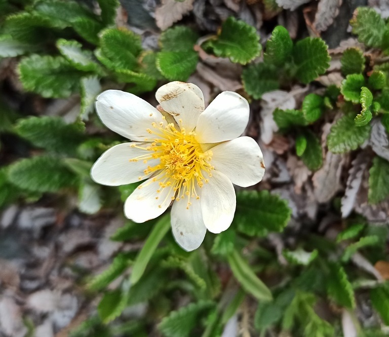 На фоне блеклых ландшафтов тундростепи, на увлажненных участках появляются яркие ковры из фиалок, огоньков, незабудок, дриад острозубчатых.