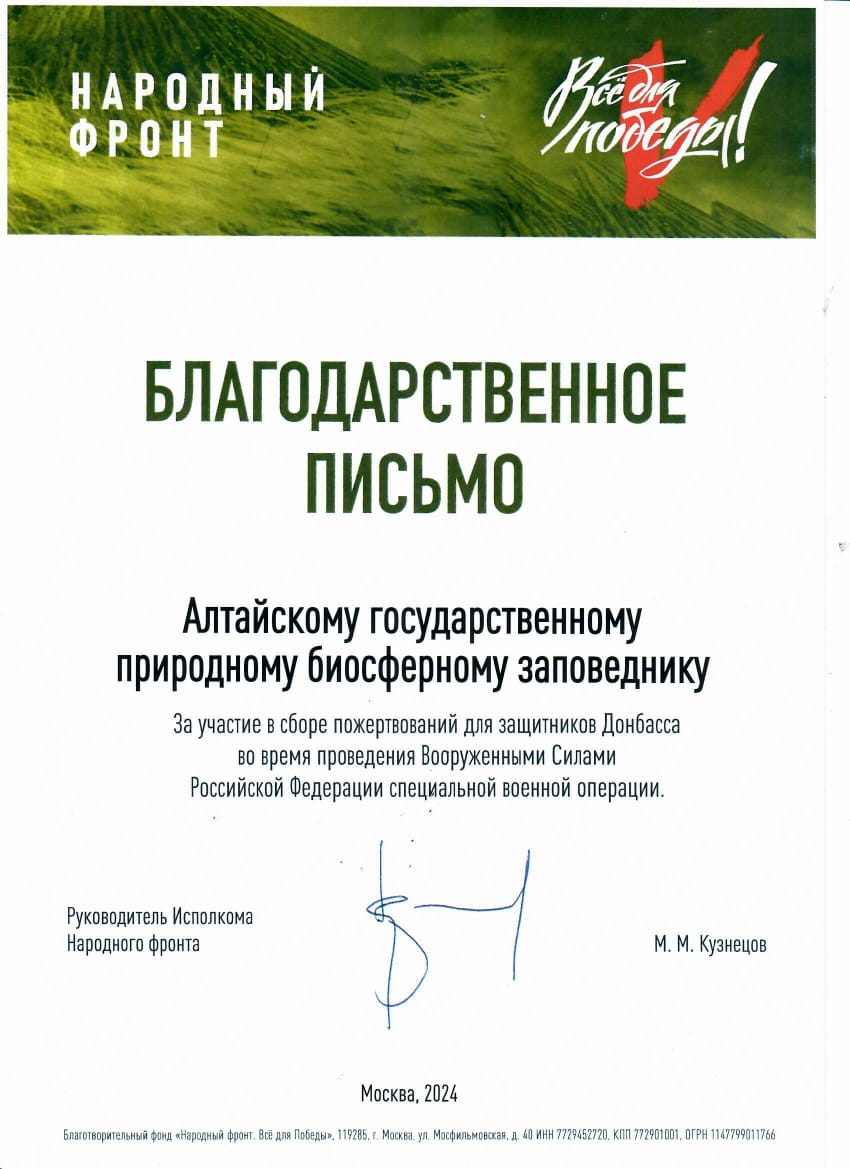 Руководитель Исполкома Народного фронта М.М. Кузнецов передал в адрес сотрудников Алтайского заповедника Благодарственное письмо за участие в сборе пожертвований для защитников Донбасса во время проведения Вооруженными силами Российской Федерации специальной военной операции.