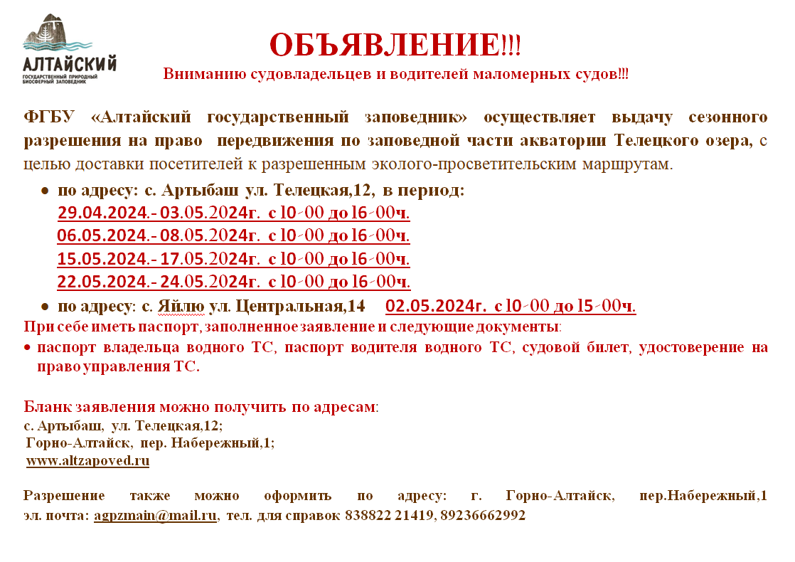ФГБУ «Алтайский государственный заповедник» осуществляет выдачу сезонного разрешения на право передвижения по заповедной части акватории Телецкого озера, с целью доставки посетителей к разрешенным эколого-просветительским маршрутам.