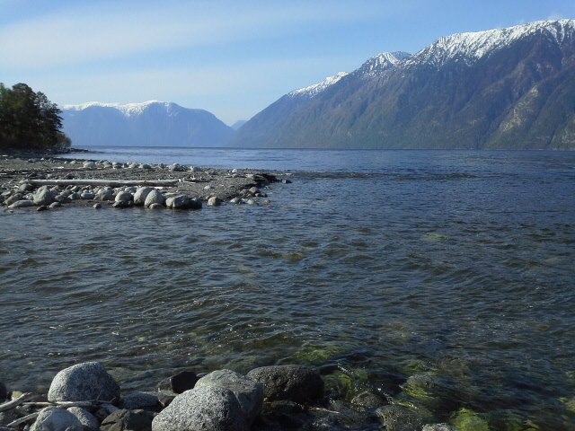 Недалеко от кордона Челюш довольно заметно вдается в озеро конус выноса сразу двух крупных рек Челюш и Баскон. Вырываясь из крутых глубоких долин, эти реки мчатся, как бы стремясь слиться, но, встретив на пути каменистый гребень и не в силах его пробить, каждая из них своим руслом уходит к озеру.