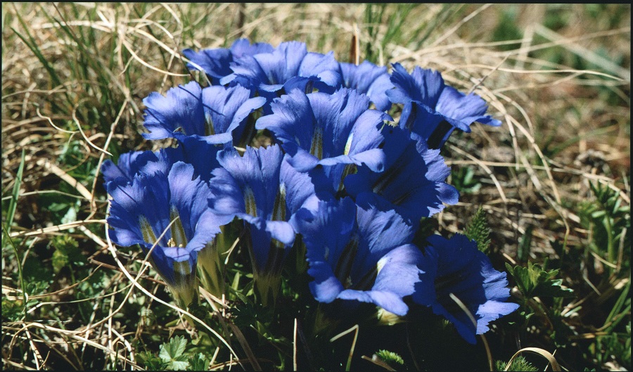 Ботаническое описание. Горечавка крупноцветковая (лат. Gentiana grandiflora Laxm.) – многолетнее травянистое растение, вид рода Горечавка (Gentiana) семейства Горечавковые (Gentianaceae). Растение высотой 0,5-10 см. Корневище ветвистое, ползучее, несущее многочисленные одноцветковые стебли и пучки прикорневых листьев. Прикорневые листья многочисленные, ланцетные, 1–3 см дл. и 2–6 мм шир.; стеблевые скучены в нижней части стебля в густые розетки. Чашечка колокольчатая, 12–20 мм дл., зубцы одинаковые, ланцетные, заостренные, в 2–3 раза короче трубочки. Венчик колокольчато-воронковидный, темно-синий, снаружи с пятью зеленоватыми волосками, длиной 35-55 мм, под зевом шириной 13-18 мм, лопасти тупые, цельнокрайние или слегка зазубренные, в 7-8 раз короче трубочки, промежуточные дольки широкие, закругленные, зазубренные, в 1,5-4 раза короче лопастей. Столбик длинный, равный завязи. Коробочка продолговатая, на ножке, выставляющаяся из венчика. Цветет в мае-июле месяце.