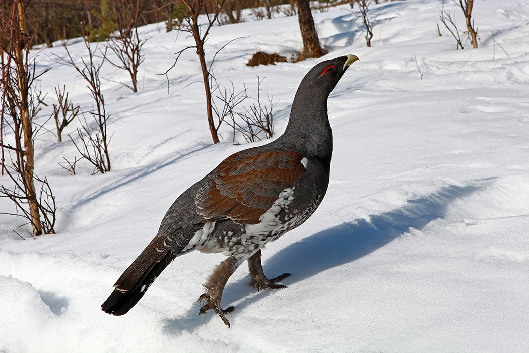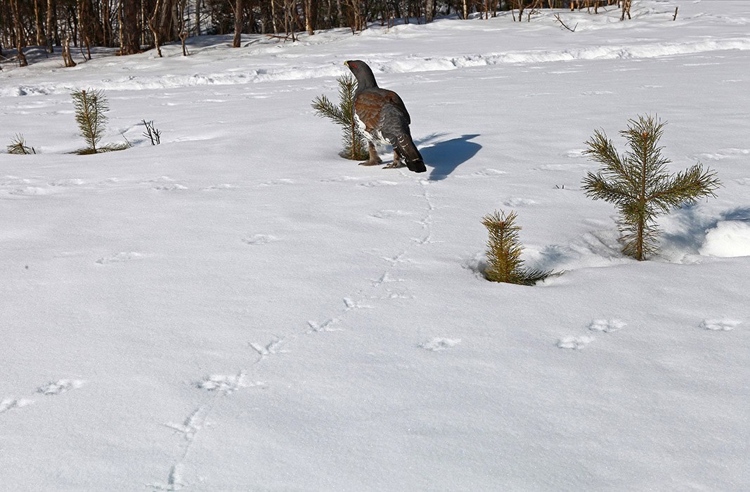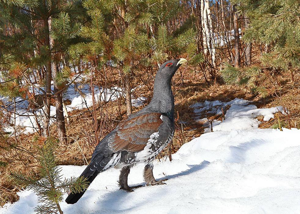 - В зимнее время глухарь питается почками разных деревьев и сосновой хвоей.