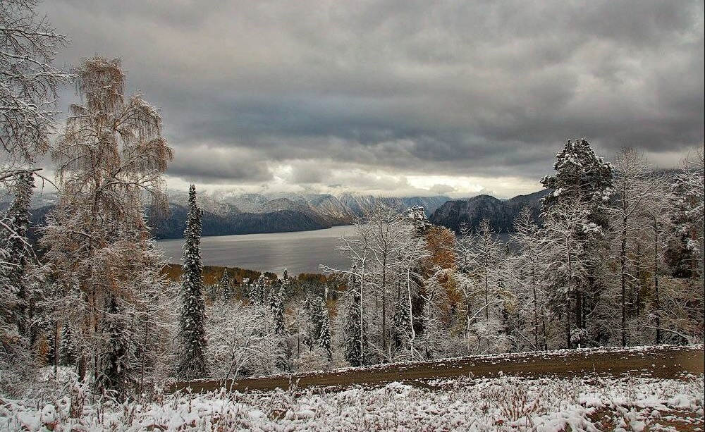 • Алтайский заповедник. Первый снег на Телецком озере. Вид с дороги с перевала Клык.