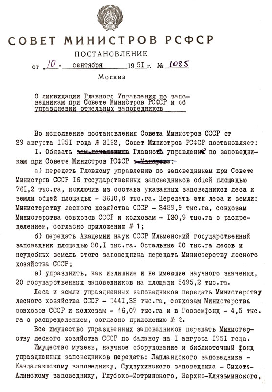Леса и земли упраздненных заповедников передали Министерству лесного хозяйства СССР – 5441,33 тыс.га, совхозам Министерства совхозов СССР и колхозам – 46,07 тыс.га и в Госземфонд – 4,5 тыс.га с распределением.