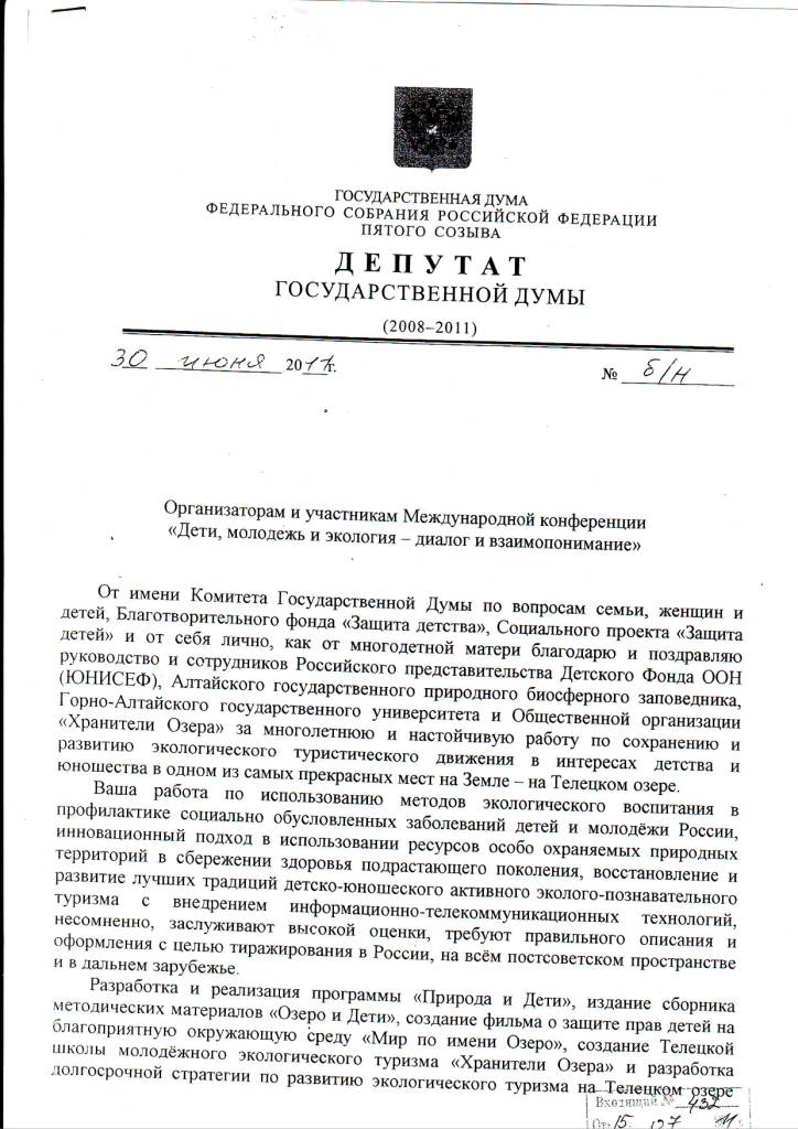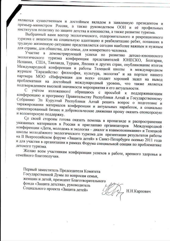 Первый заместитель Председателя Комитета Государственной Думы по вопросам семьи, женщин и детей, Наталья Николаевна Карпович, выразила благодарность за многолетнюю и настойчивую работу по сохранению и развитию экологического туристического движения в интересах детства и юношества, организаторам и участникам Международной конференции "Дети, молодежь и экология - диалог и взаимопонимание", прошедшей в августе 2011 года в поселке Яйлю, на Телецком озере.
