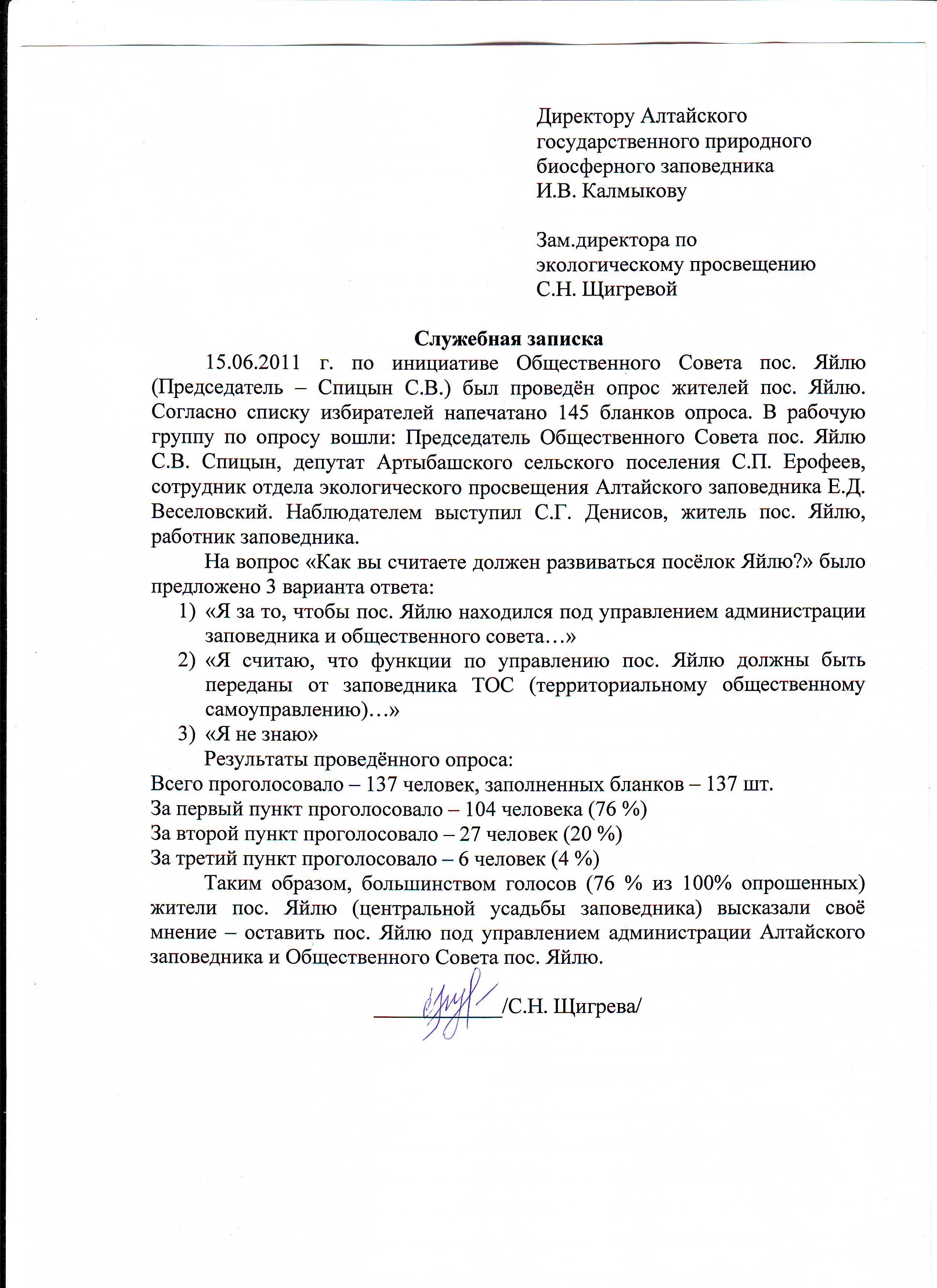 Итоги результатов опроса жителей пос. Яйлю (центральной усадьбы Алтайского заповедника) – в служебной записке от зам.директора по экопросвещению
