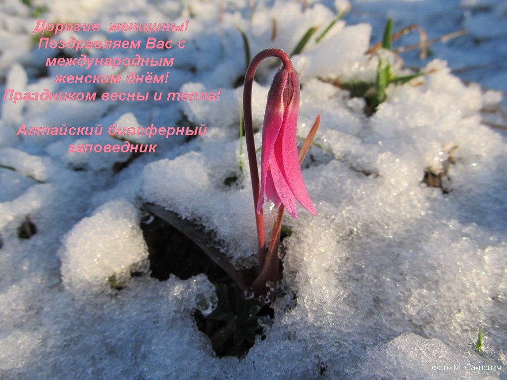 С праздником весны! Дорогие девочки, девушки, женщины! Алтайский биосферный заповедник поздравляет с замечательным праздником весны. Будьте всегда милы, нежны и прекрасны как первые весенние цветы, дарите радость друг другу и всем окружающим.