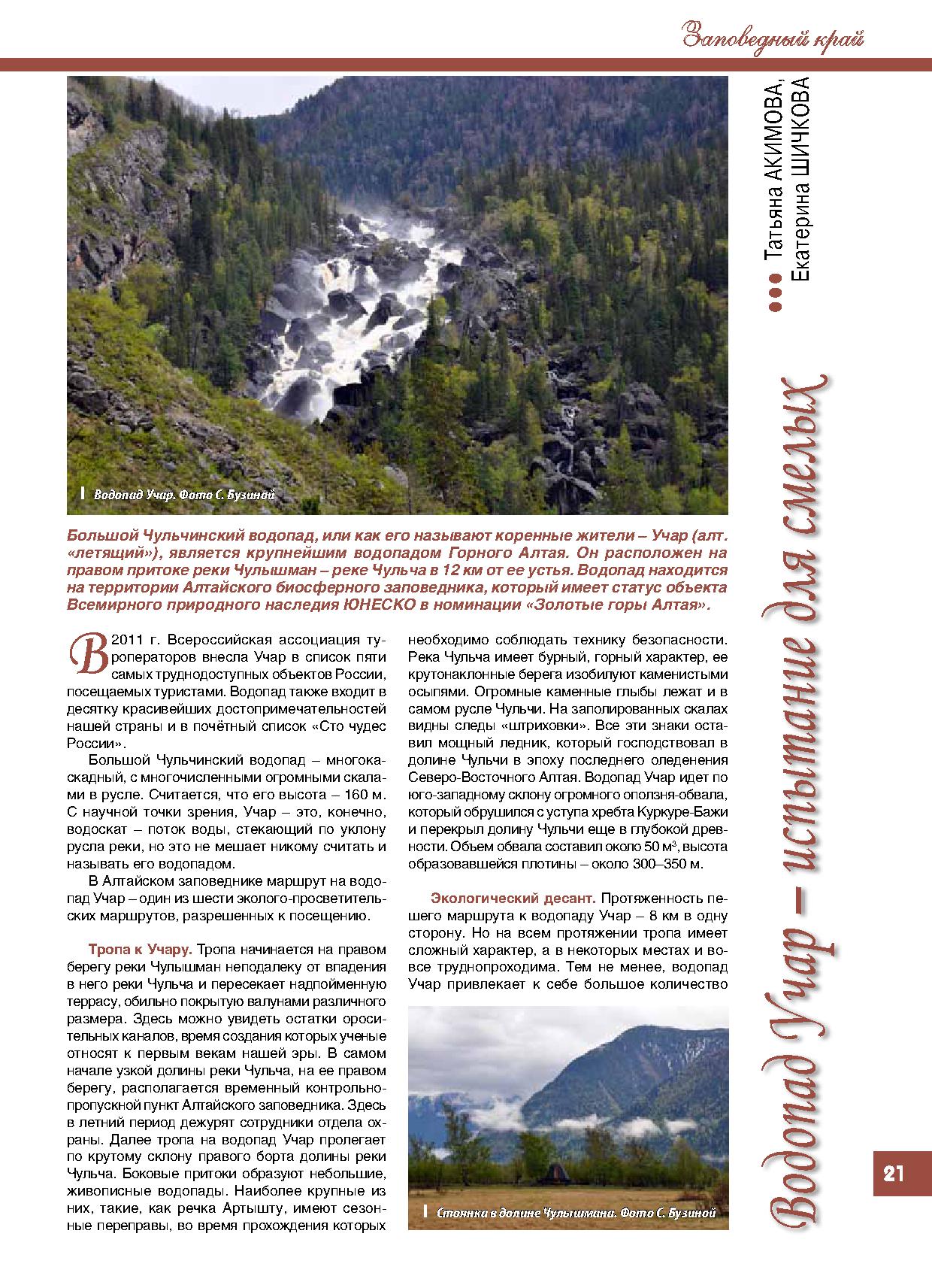 «Водопад Учар – испытание для смелых…» сотрудники заповедника рассказали о самом большом в Горном Алтае каскадном водопаде Учар (Большой Чульчинский водопад). Этот необыкновенный водоскат расположен на территории Алтайского заповедника, на правом притоке Чулышмана — реке Чульча в 11-12 километрах от места ее впадения в Чулышман. В 2011 году ассоциация туроператоров внесла Учар в список 5 самых труднодоступных достопримечательностей России. Маршрут на водопад Учар – один из шести эколого-просветительских маршрутов, разрешённых в заповеднике к посещению. В статье рассказывается об изменениях, которые произошли на тропе, а также приводятся отзывы посетителей обновлённого маршрута.