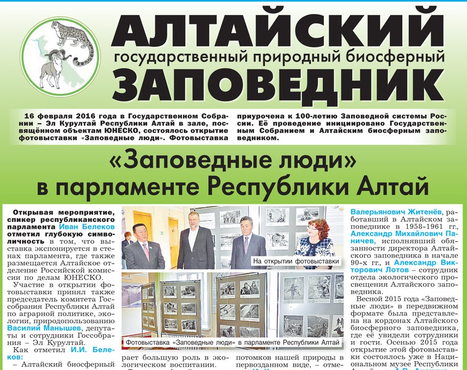 Материалы об Алтайском заповеднике в очередном выпуске газеты "Природа Алтая" В новом выпуске газеты "Природа Алтая" №3 (243) 2016 года размещены материалы об Алтайском биосферном заповеднике. Статья "Заповедные люди в парламенте Республики Алтай" рассказывает об открытии фотовыставки о людях заповедника. О том "Как зимуют аргали" рассказывает старший научный сотруник Алтайского заповедника Сергей Спицын и начальник опергруппы Сергей Абрамов. Также читатели узнают из материалов, размещенных на страницах газеты о том, как Алтайский биосферный заповедник продолжает развивать на своей территории альтернативные способы получения энергии.