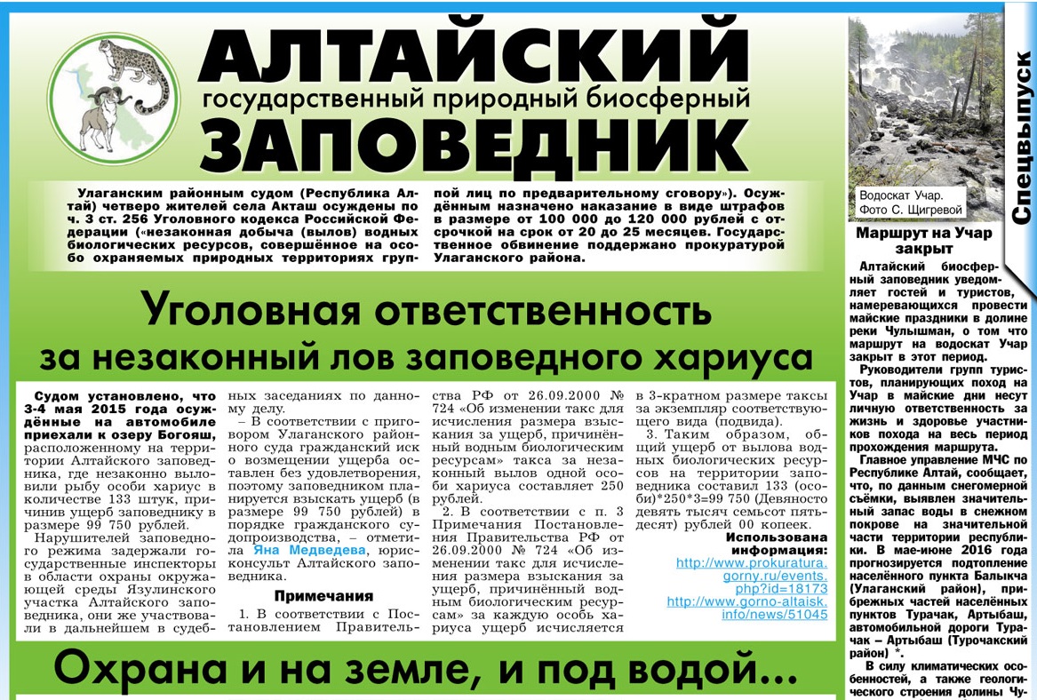 В очередном выпуске газеты "Природа Алтая" (№4,2016) размещены материалы об Алтайском заповеднике В очередном выпуске газеты "Природа Алтая" №4 (244) 2016 года размещены новые материалы об Алтайском биосферном заповеднике. В заметке "Уголовная ответственность за лов заповедного хариуса" рассказывается о нарушении заповедного режима, случившемся в мае 2015 года и о решении суда по этому вопросу. О том как необычные волонтёры-дайверы помогают в охране территории заповедника можно прочитать в статье "Охрана на земле и под водой", важная информация для посетителей представлена в заметке "Маршрут на Учар закрыт"Познакомиться с материалами выпуска об Алтайском заповеднике можно на сайте заповедника, в разделе "Публикации в газетах и журналах". Смотреть весь выпуск на сайте "Природа Сибири".