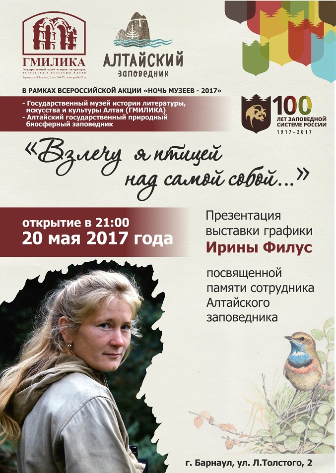 "Взлечу я птицей над самой собой" 20 мая 2017 года, в рамках всероссийской акции "Ночь музеев-2017" в Государственном музее истории литературы, искусства и культуры Алтая состоится выставка графики Ирины Филус, посвященная памяти сотрудника "Взлечу я птицей над самой собой". Открытие в 21:00.