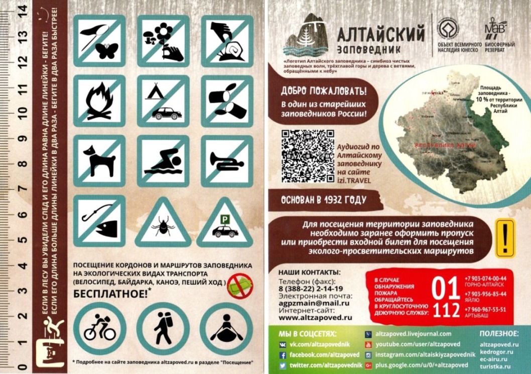 Флаер содержит информацию об особенностях Алтайского заповедника, контакты и ссылки на группы в соцсетях. Здесь же расположен и QR-код, который можно отсканировать с помощью своего мобильного устройства и воспользоваться бесплатным аудиогидом по двум маршрутам Алтайского заповедника. О правилах нахождения на заповедной территории напоминают значки-иконки. Листовка снабжена линейкой, которой можно воспользоваться, например, для измерения ширины медвежьего следа, о чем написано в шуточной инструкции рядом с линейкой.