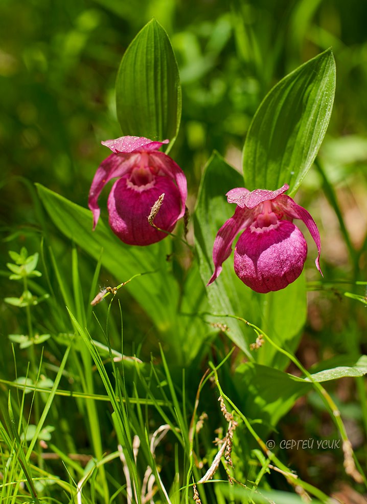 Среди травянистых растений Алтайского заповедника очень разнообразны представители семейства Орхидные (Orchidаceae). Распространены они, в основном, в прителецкой части заповедника. Многие виды редки, малочисленны и были включены в Красную книгу России и Красную книгу Республики Алтай. Среди этих видов более широко распространен Башмачок крупноцветковый (лат. Cypripedium macranthos Sw.), который считается самой крупной орхидеей здешних мест. У этого растения существует много других названий: Венерин башмачок крупноцветковый, Башмачок крупноцветный, Башмачок Тунберга, ограниченно распространённые названия: Адамова голова синяя, Кошельки, Кукушкины башмачки, Кукушкины сапожки, Мудушки, Сапожки Богородицы, Царь-трава. Название цветка происходит из сказок и легенд, а цветок, своей необычной формой, напоминающий шелковую женскую туфельку, появился на земле благодаря милой забывчивости и рассеянности богини Венеры. По одной из легенд влюблённые Венера (богиня любви) и Адонис (бог красоты) спрятались во время дождя в кроне дерева, а золотой башмачок соскользнул с ножки богини прямо на дорогу, по которой проходил мимо охотник. Обрадованный драгоценной находкой человек протянул руку к башмаку, но тот мгновенно превратился в прекрасный цветок.