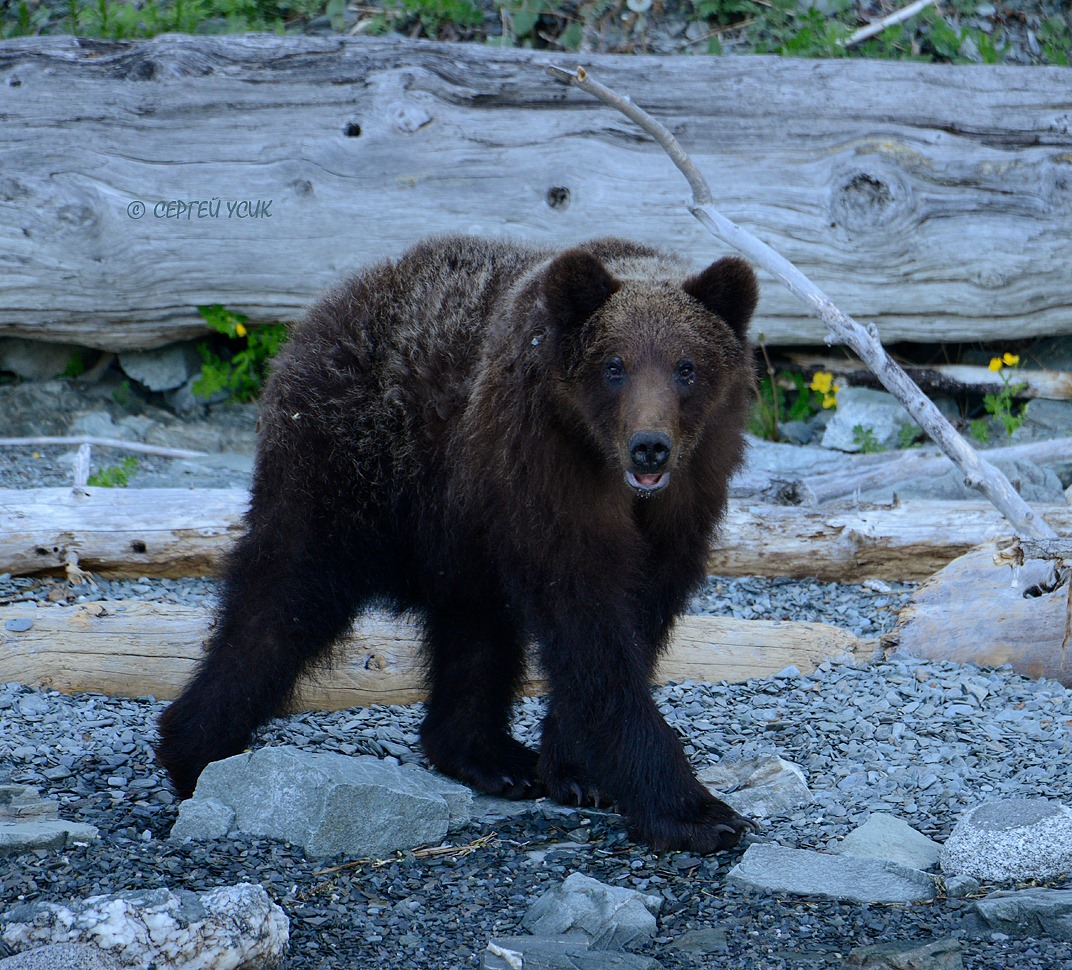 «На обратном пути встретил гуляющего по берегу молодого медведя. Как и всякий молодняк, прежде чем убежать, мишка минут пять боролся с любопытством и страхом. Присел на брёвнышко и стал наблюдать за мной, однако нервы всё же не выдержали и миша рванул вверх по склону. Прежде чем скрыться в кустах косолапый оглянулся на прощание. Мне этого времени хватило чтобы подъехать поближе и сделать серию кадров. Пока, мишка, спасибо за фотосессию», - поделился впечатлением государственный инспектор.
