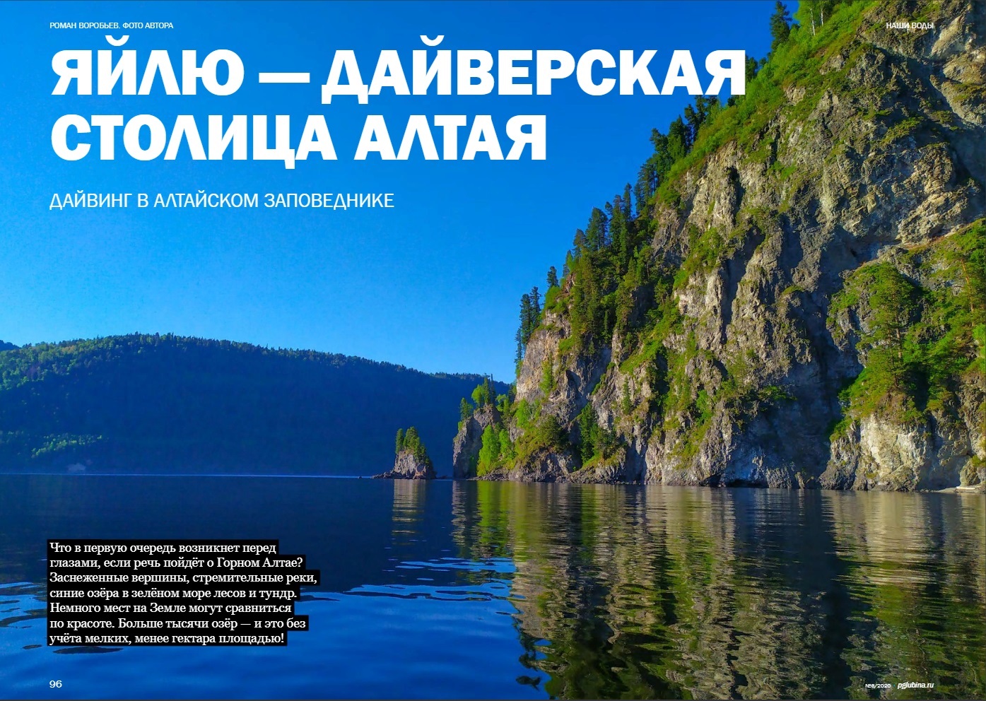 Роман Воробьёв - дайвер, сотрудник научного отдела Алтайского заповедника, в статье "Яйлю - дайверская столица Алтая" знакомит читателей с Алтайским заповедником и Телецким озером, рассказывает об особенностях погружений в воды Телецкого озера весной, летом, осенью и зимой. Дополняет статью экскурсия в мир подводной фауны озера, в сопровождении красочных иллюстраций как крупных щуки, налима и хариуса, так и самых мелких обитателей - рачков-циклопов и гидр. Отдельный блок в статье посвящен рассказу о станции подводных исследований Алтайского заповедника - "Зазеркалье", расположенной в с. Яйлю