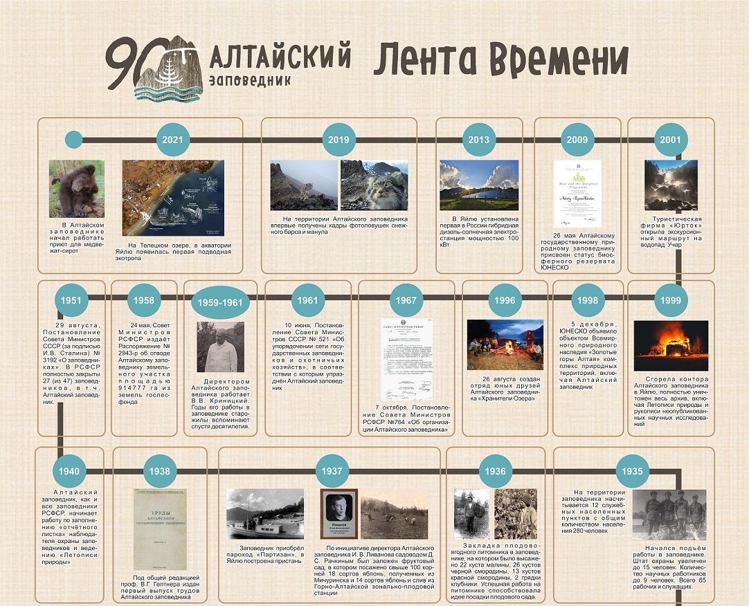 К 90-летнему юбилею Алтайского заповедника мы подготовили «Ленту времени» — краткий обзор значимых событий за историю заповедника. Эта инфографика - часть вкладыша юбилейного выпуска газеты «ЗаповедЪ Без границ».